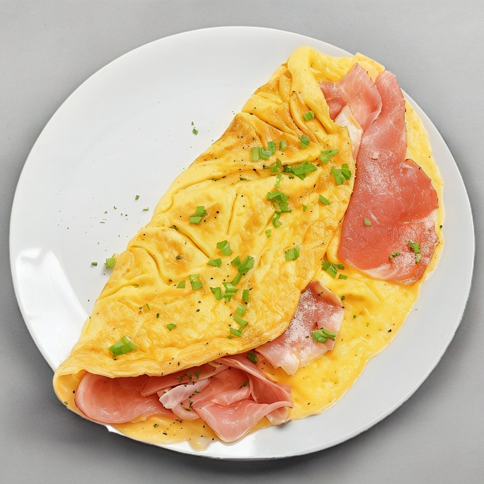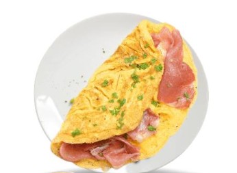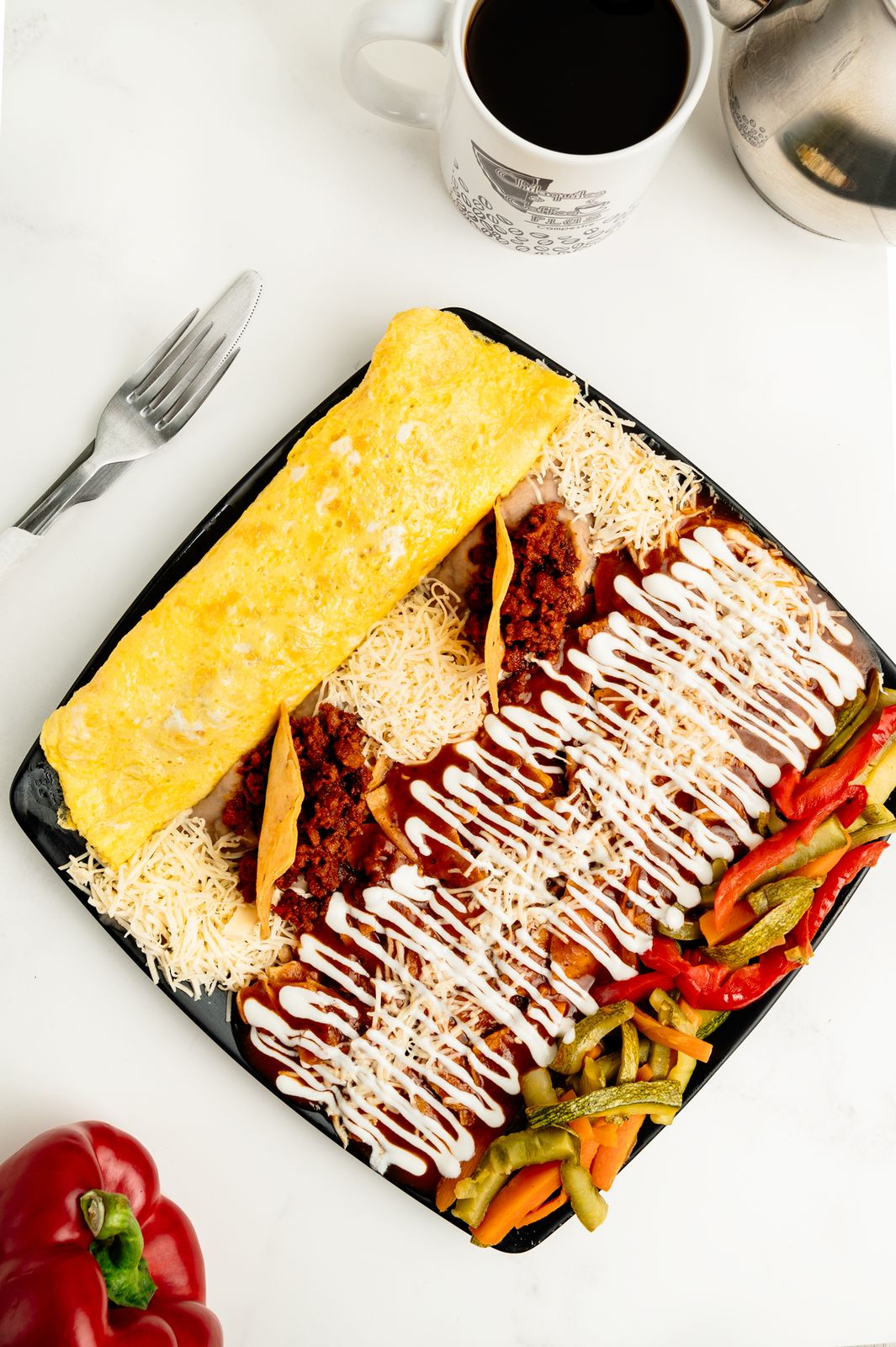 Omelette con un ingrediente gusto, acompañado de frijoles refritos con chorizo, chilaquiles con salsa al gusto y verduras salteadas.