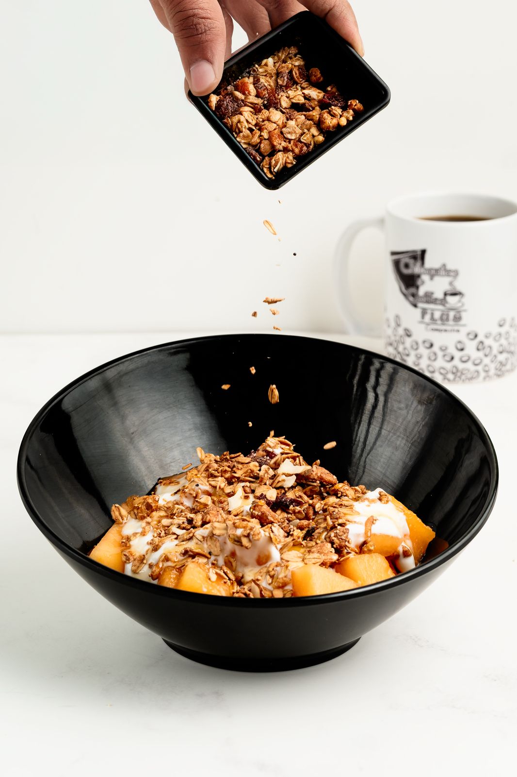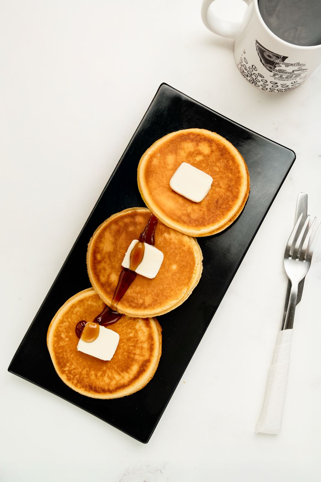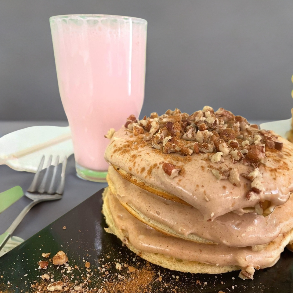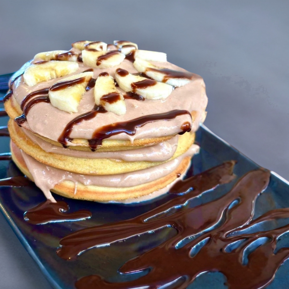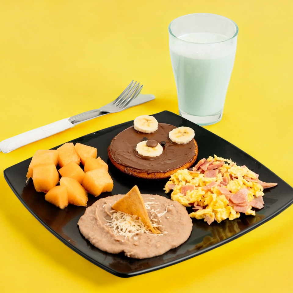 Hot cake con crema de maní o nutella, plátano, chocolate. Acompañado de huevo revuelto con jamón, frijoles refritos y fruta. Incluye malteada o licuado chico.