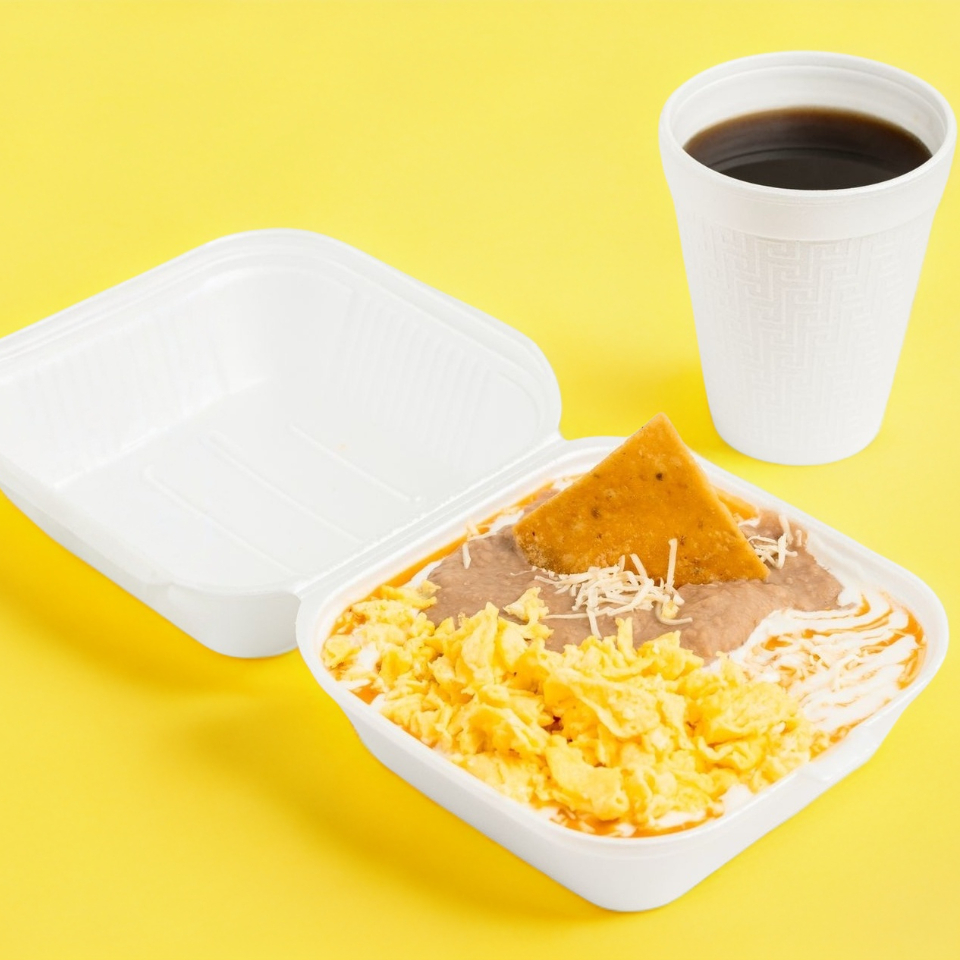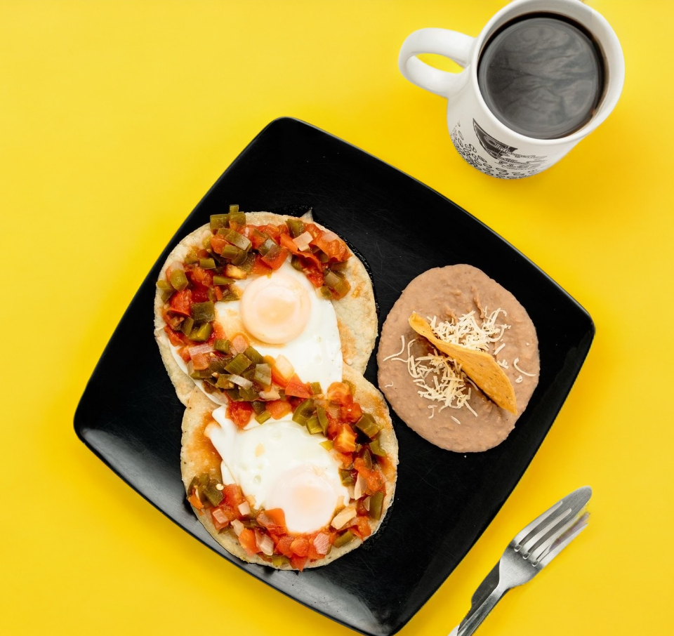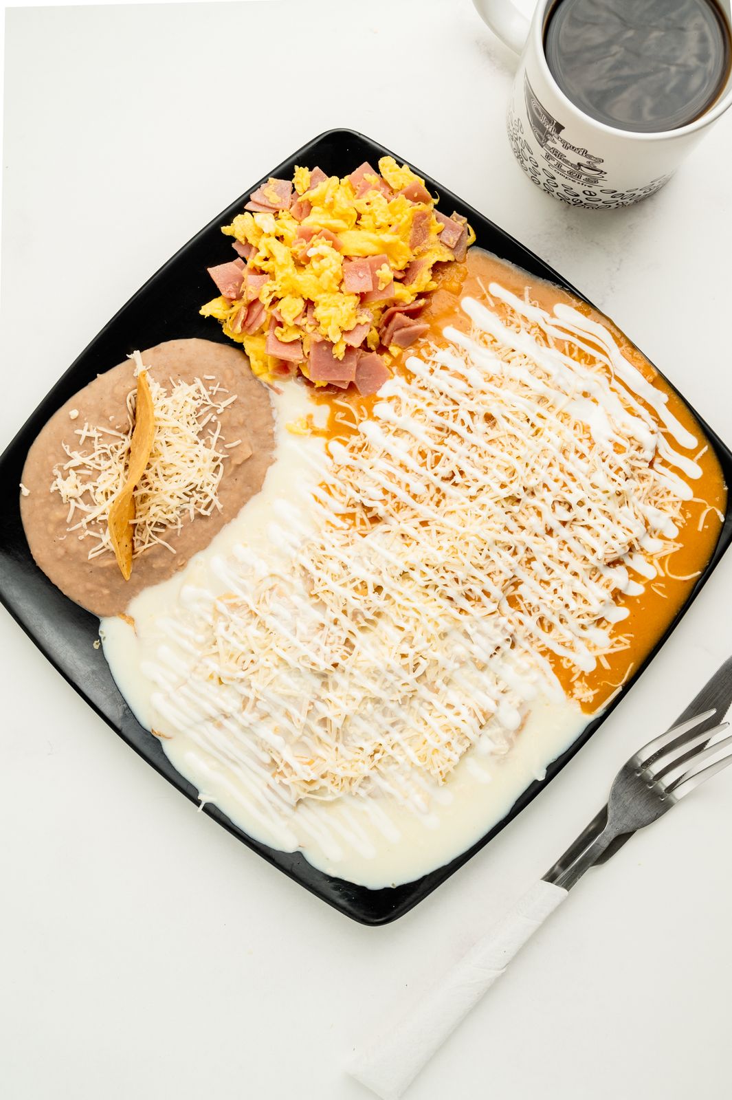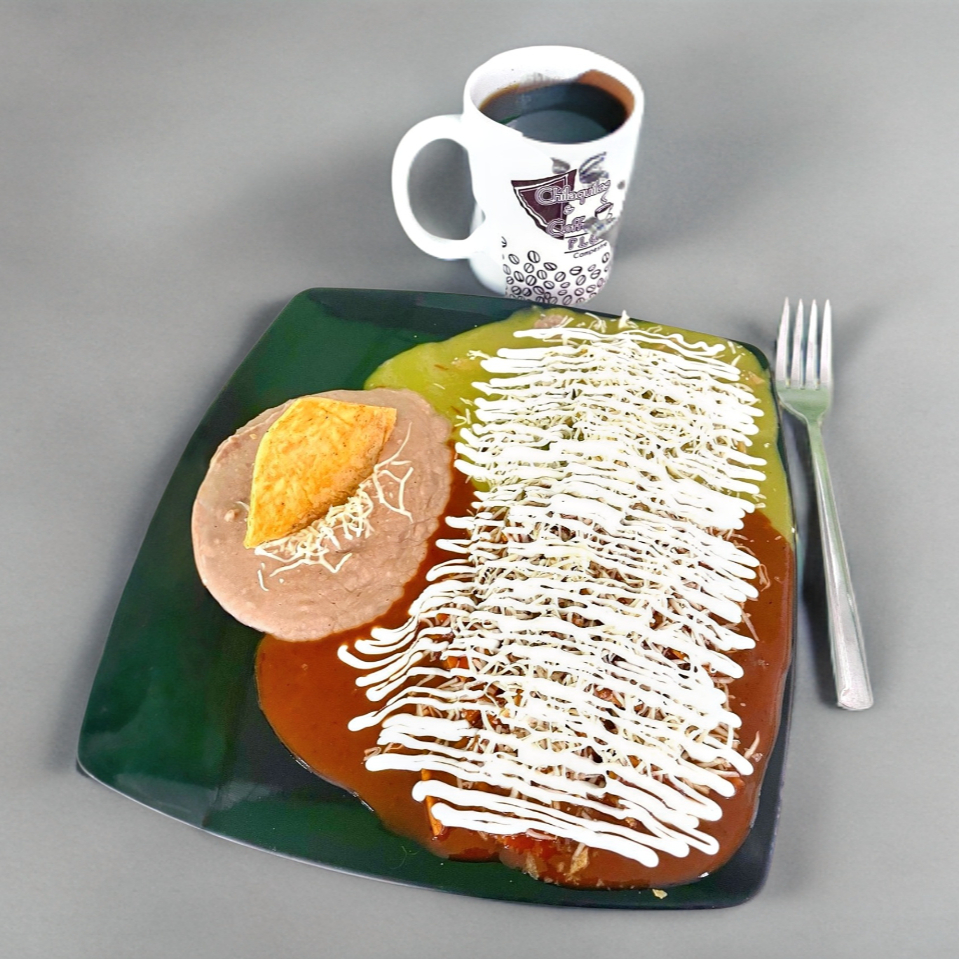 Incluye Chilaquiles con queso y crema, un huevo estrellado o revuelto, frijolitos y un cafe de olla