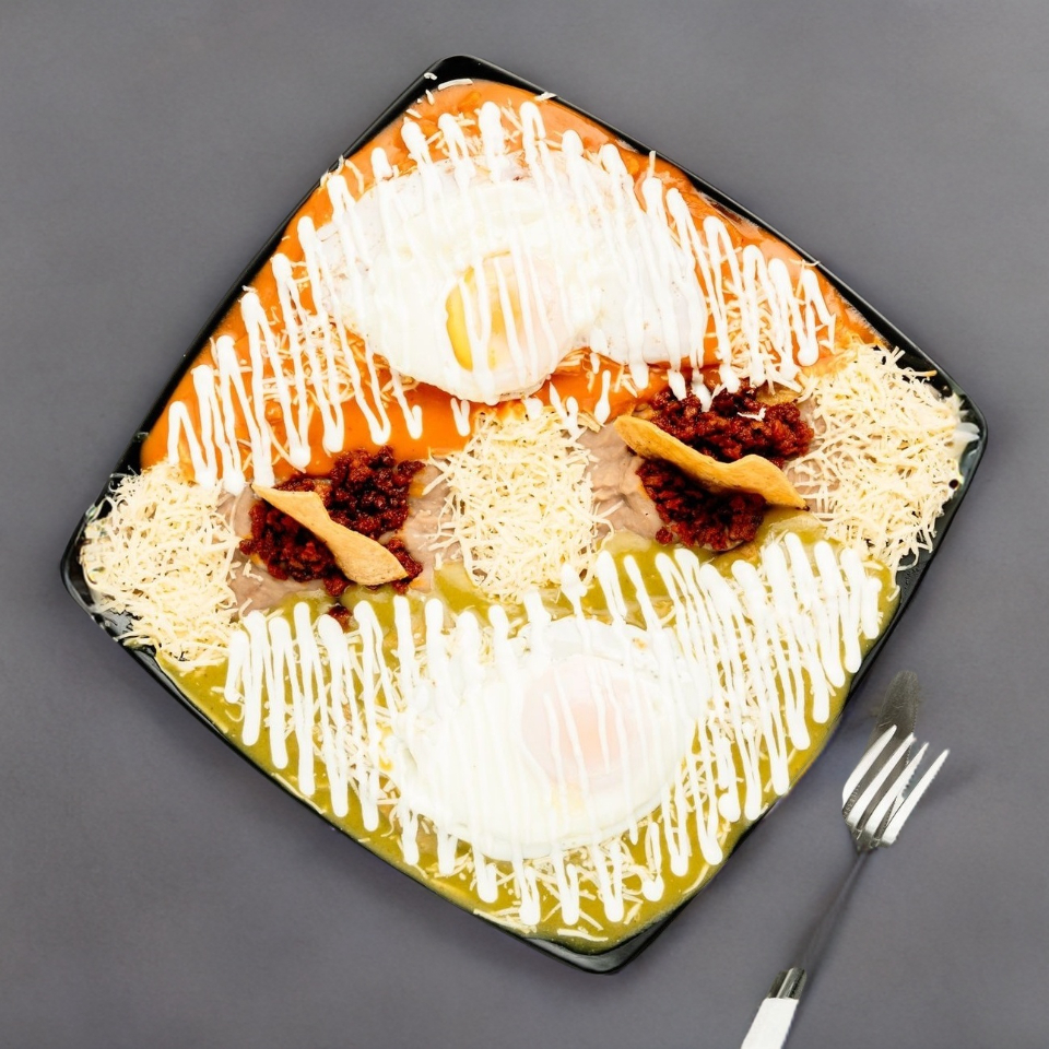 Par de huevos estrellados montados en sobre chilaquiles con dos salsas de tu preferencia acompañados de frijoles refritos con chorizo.