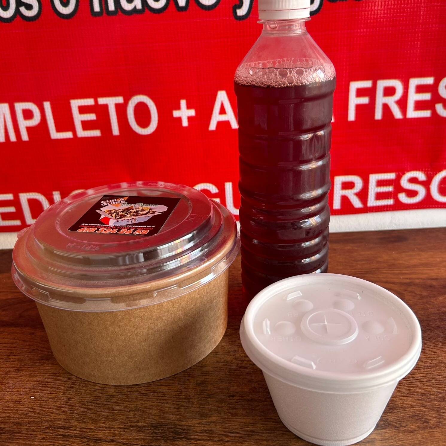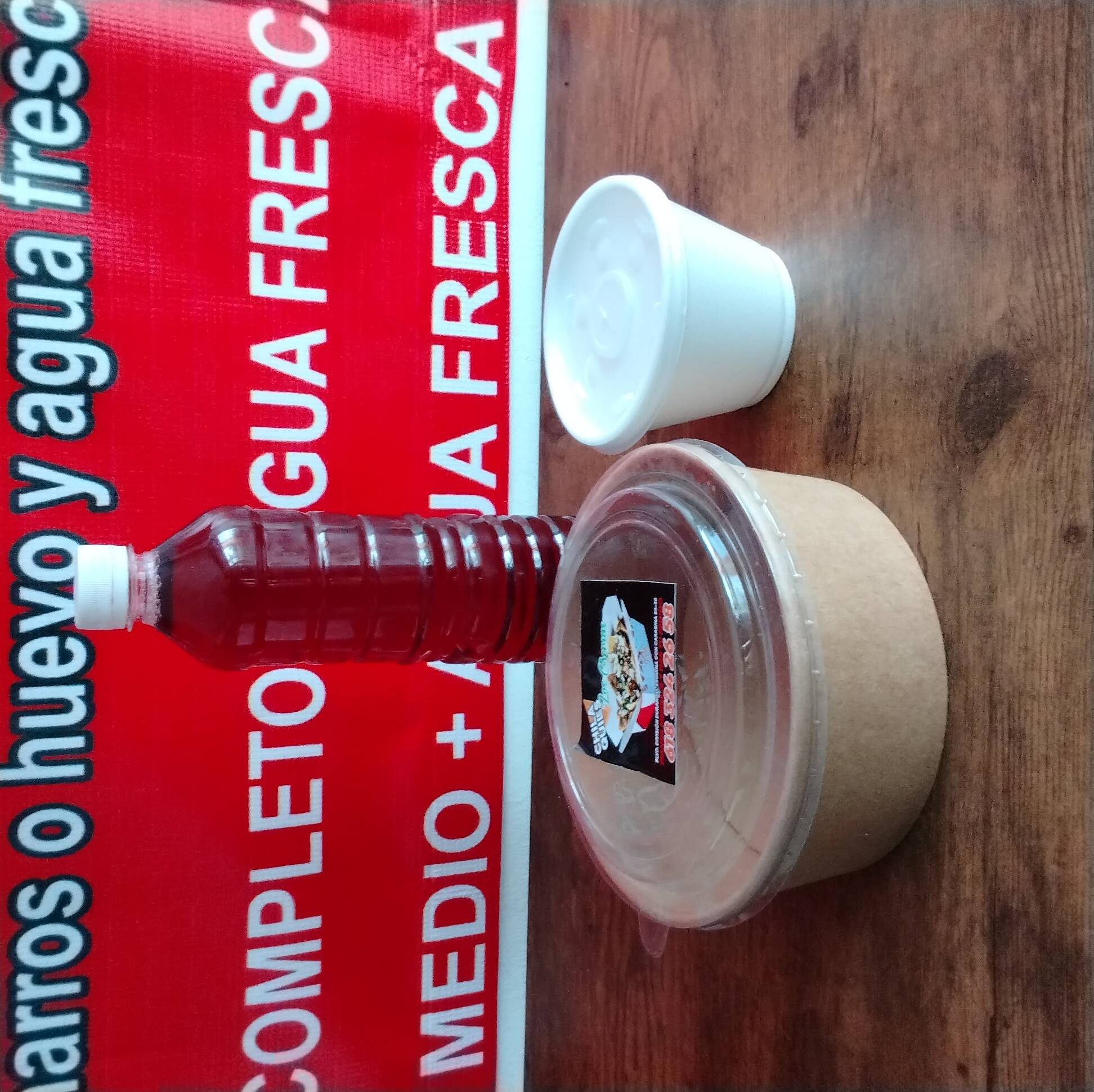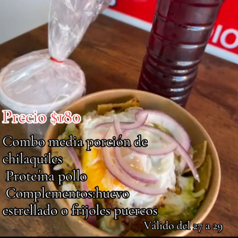 Medio chilaquil , frijoles puercos o huevo y agua fresca.