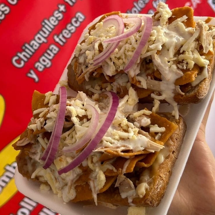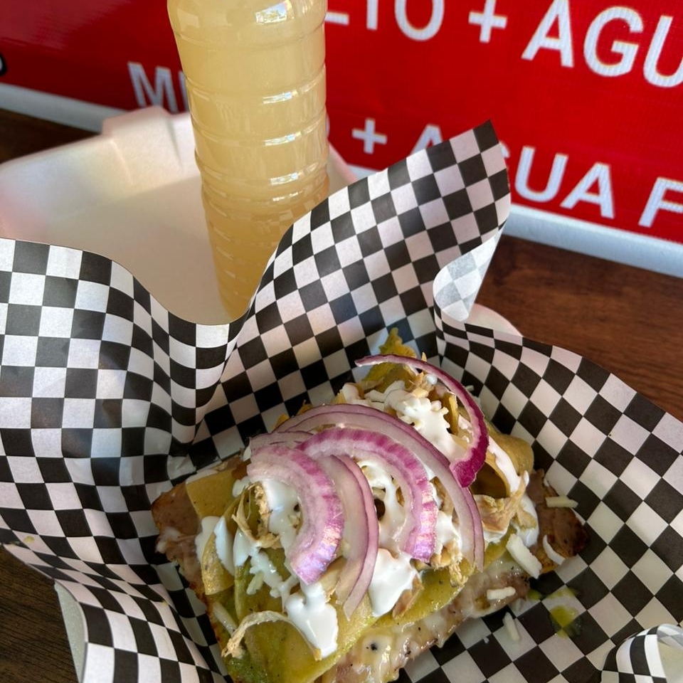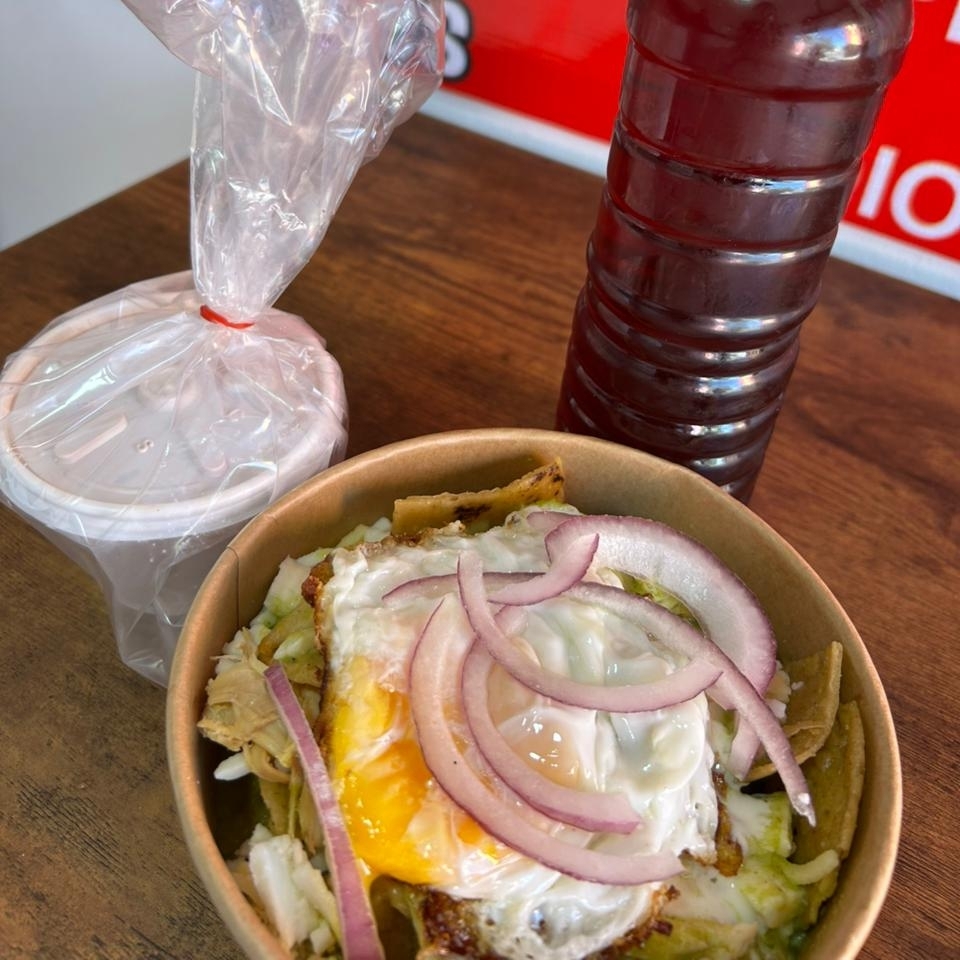 Chilaquiles con tu salsa y proteína Fav, Crema, Cebolla morada, queso y Agua Fresca