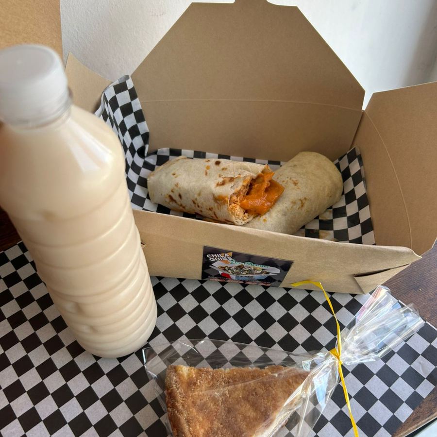 Burrito relleno de chilaquiles con salsa a escojer y Proteina:Carne asada o pollo y Rebanada de pay