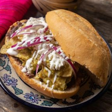 Torta de Chilaquiles: elaborados con pan fresco, chilaquiles (verdes, rojos o suizos), proteína (pollo, chamorro de puerco o prensado), queso, crema, cebolla y cilantro.