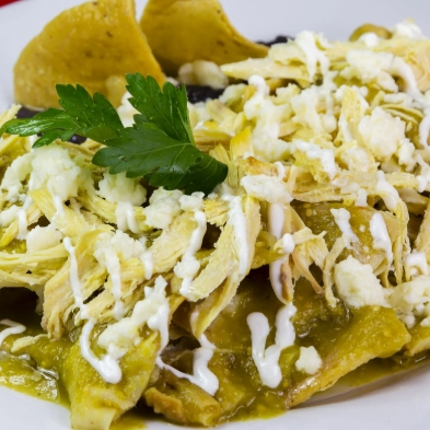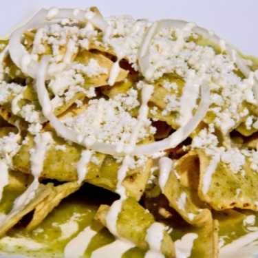 Chilaquiles Verdes, elaborados con salsita de jalapeño picosita, totopos de maíz, queso, crema y proteína de elecciòn (Pollo, Chamorro de Puerco o Prensado).
