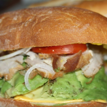 Torta Lagunera hechas con pan fresco, carnitas de puerco, aguacate, queso blanco, tomate y mayonesa.