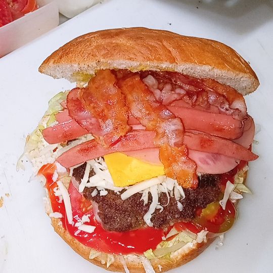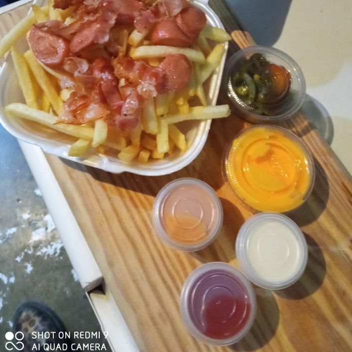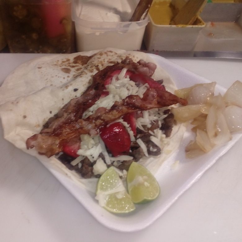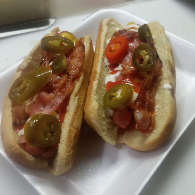 Salchicha y tocino mayonesa, cátsup,rajas y queso para nachos.