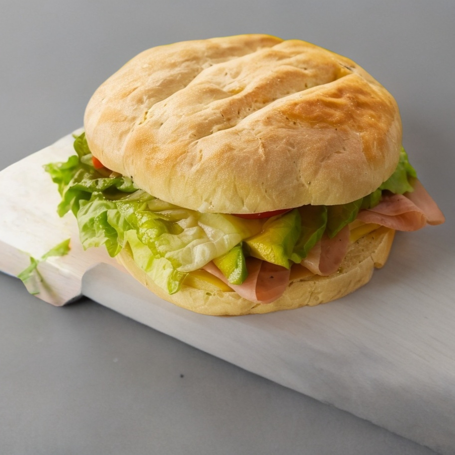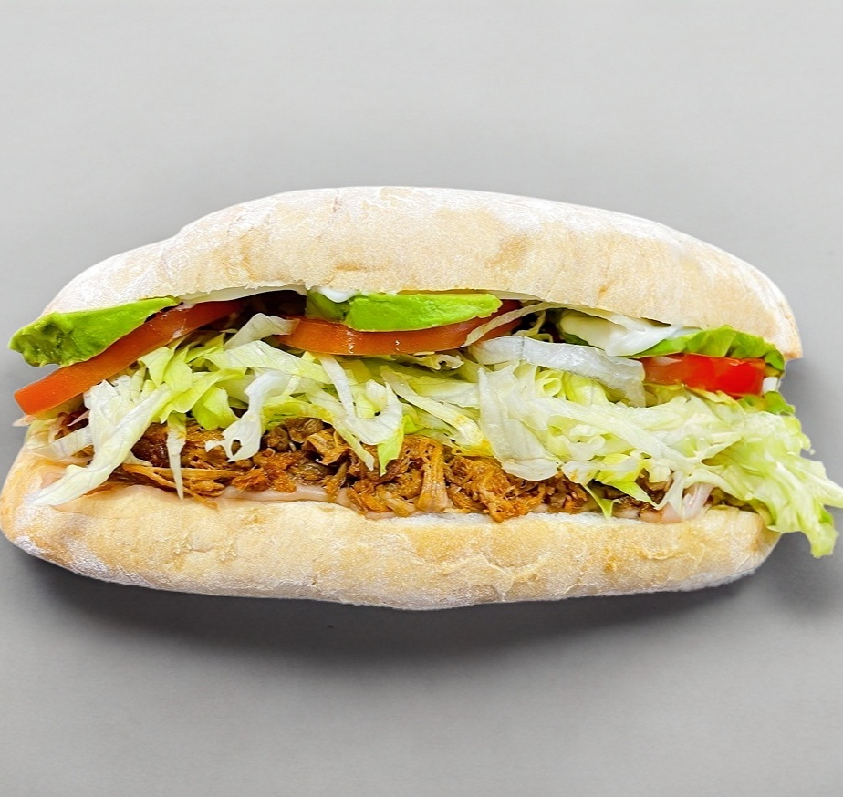 Deliciosa torta con pan de agua, jamon de pavo, queso, aguacate