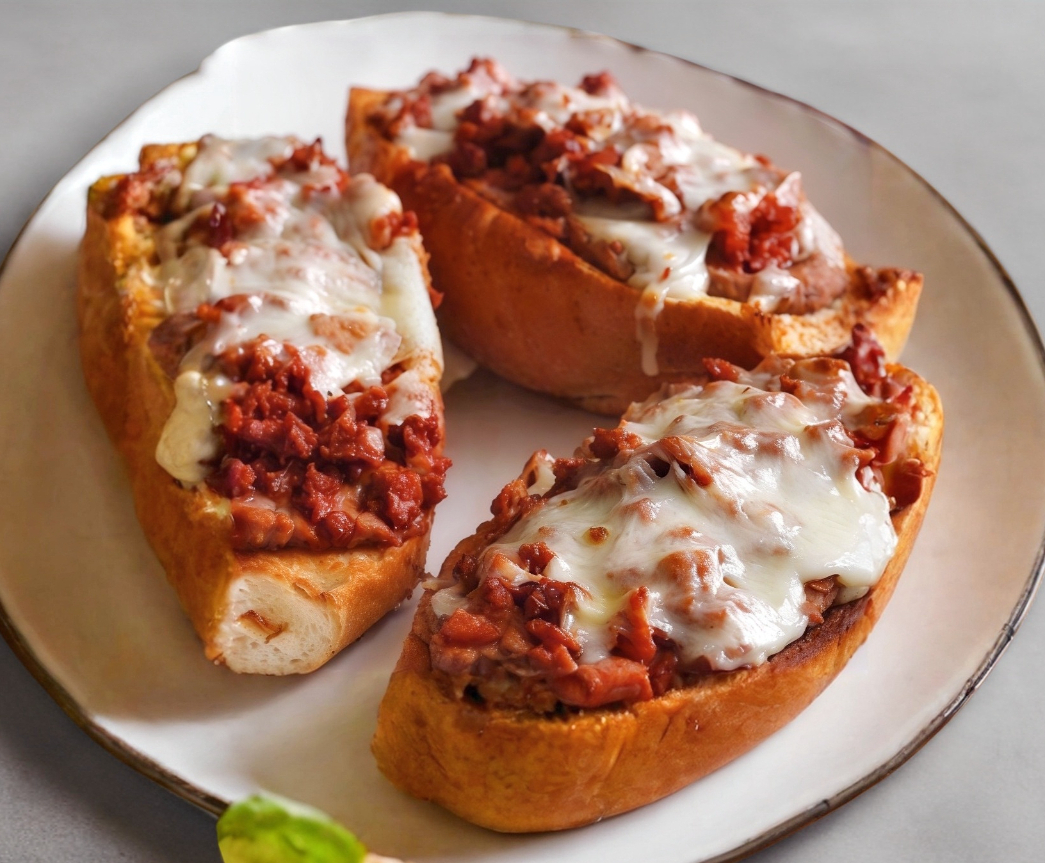 2 piezas de mollete, en pan de agua, con deliciosos frijoles refritos y queso gratinado.