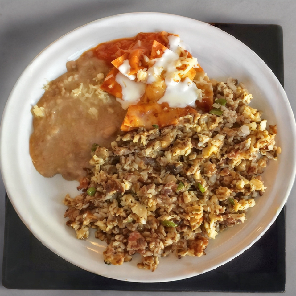 2 pzas de huevos estrellados acompañados de chilaquiles y frijoles
