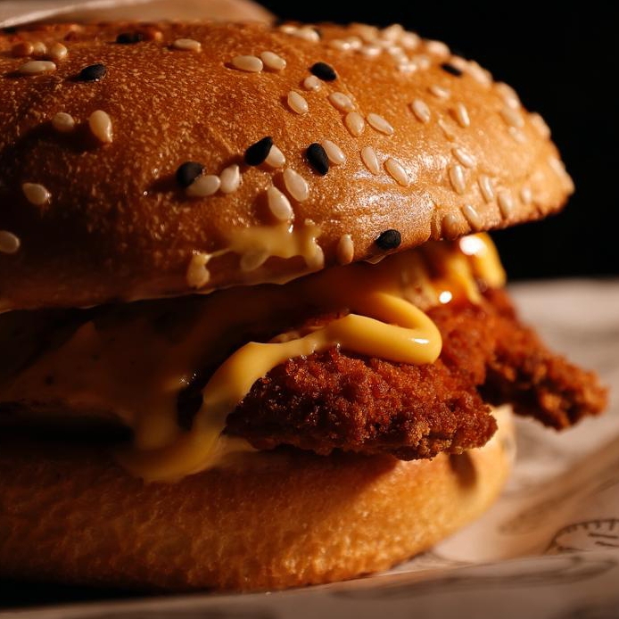 Pechuga de pollo empanizada , cebolla caramelizada, aderezo de la casa, queso cheddar, pepinillos, tocino, jalapeños en trozos y la salsa de tu elección.