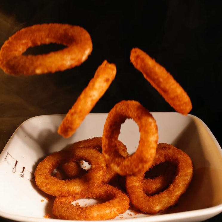 Hamburguesa con 150g de carne hecha en casa, aros de cebolla fritos, cebolla caramelizada, aderezo de la casa, queso americano, salsa BBQ, pepinillos, tocino, y jalapeños en trozos.