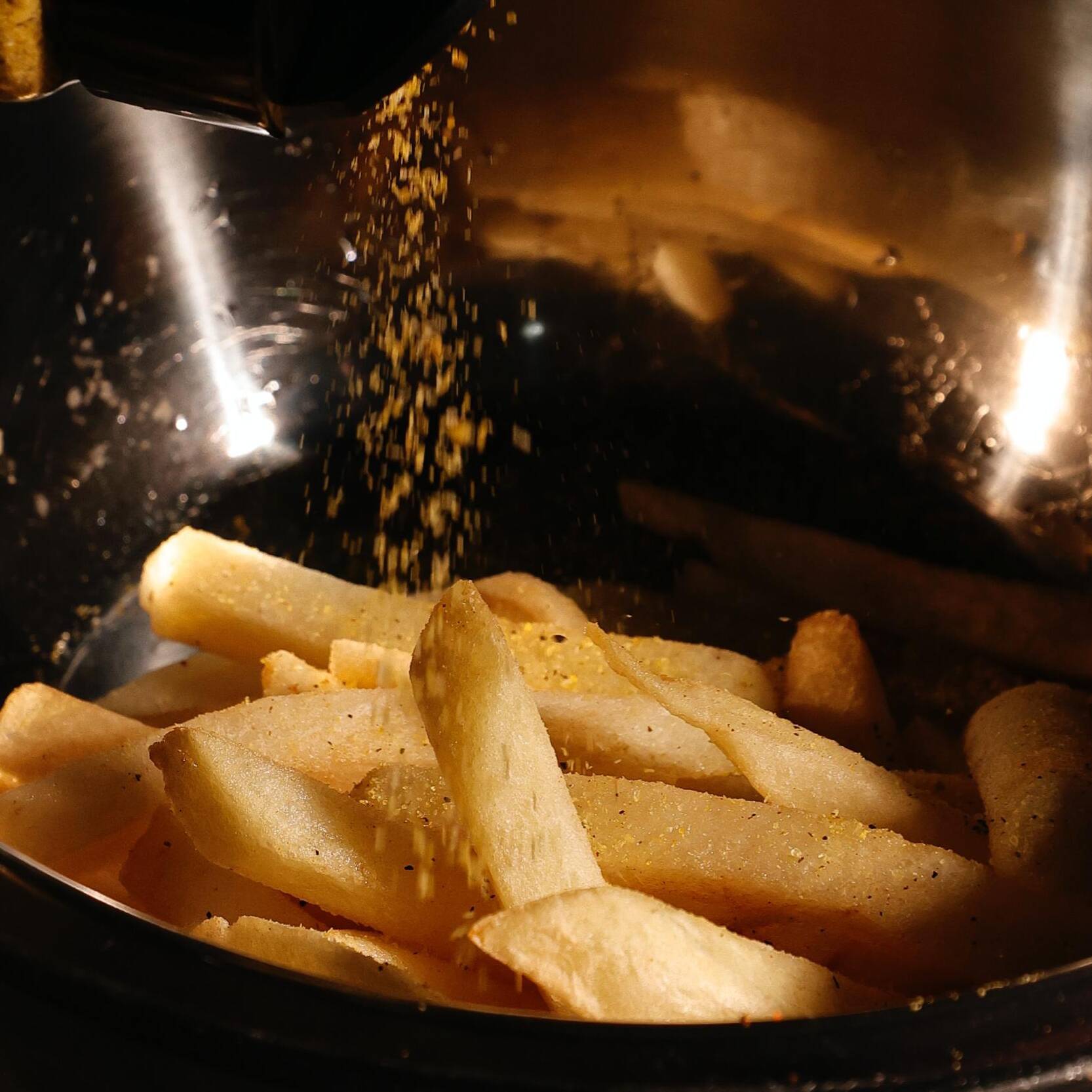 Suculenta hamburguesa perla acompañada de 150 gr de papas a la francesa, sazonadas a tu gusto y una bebida de tu elección.