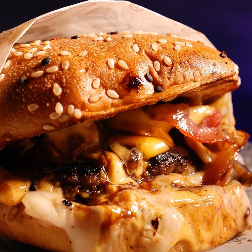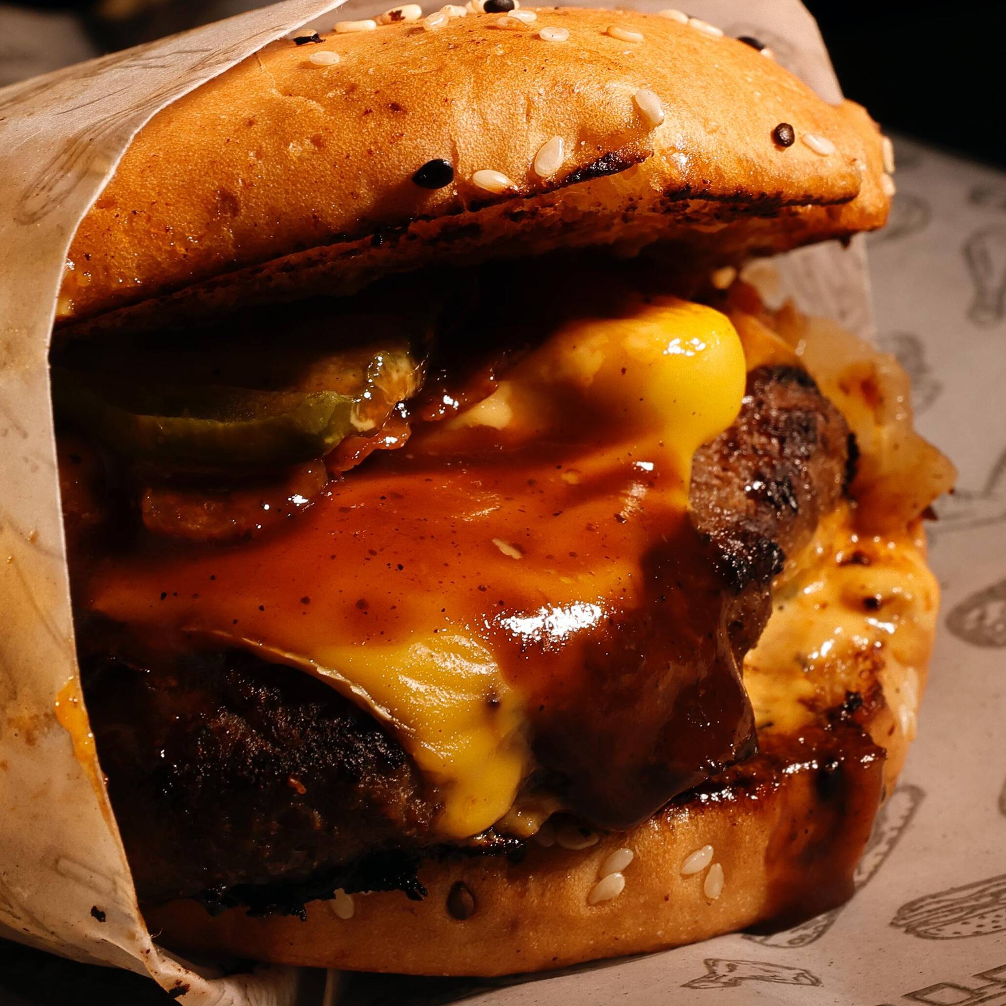 Hamburguesa con 150g de carne hecha en casa, cebolla caramelizada, aderezo de la casa, queso americano, salsa BBQ, pepinillos, tocino, y jalapeños en trozos.