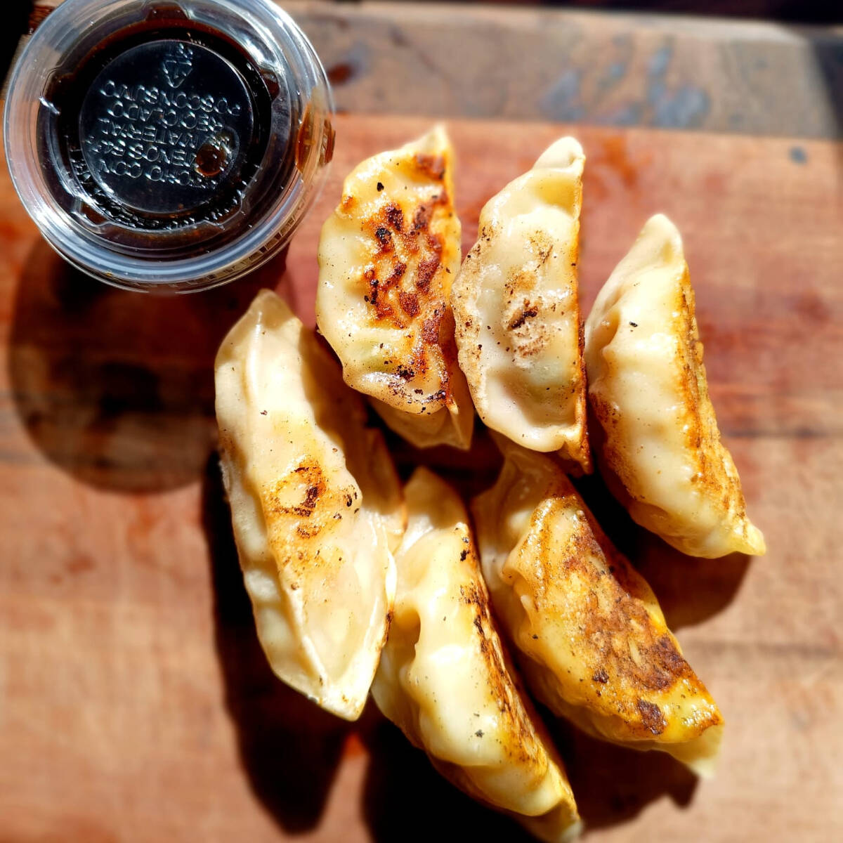 6 Empanadas estilo oriental, de masa delgada, rellenas de puerco o pollo, verduras y acompañadas de salsa Teriyaki.