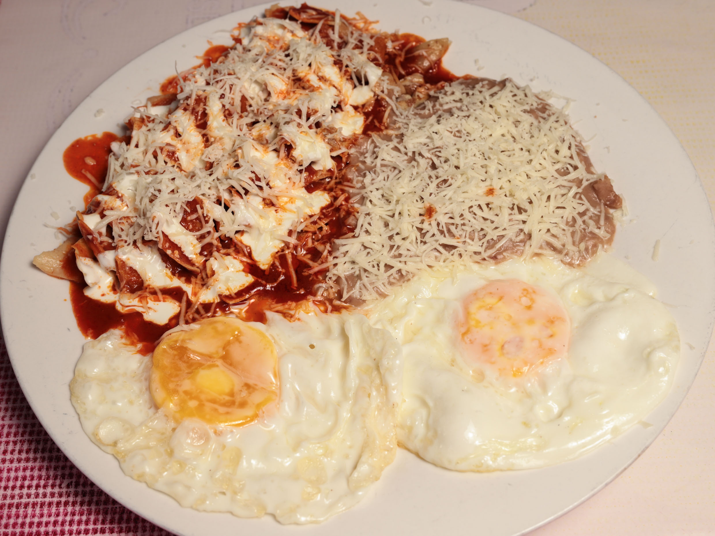 2 Huevos estrellados con chilaquiles en salsa roja dulce. Con queso y crema acompañado de frijoles refritos.