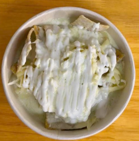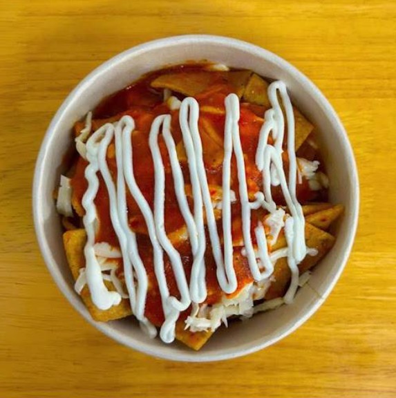 Bowl de chilaquiles personales preparado con la salsa de tu preferencia, pollo desmenuzado, frijoles, crema, queso Chihuahua rallado, cebolla morada y cilantro.