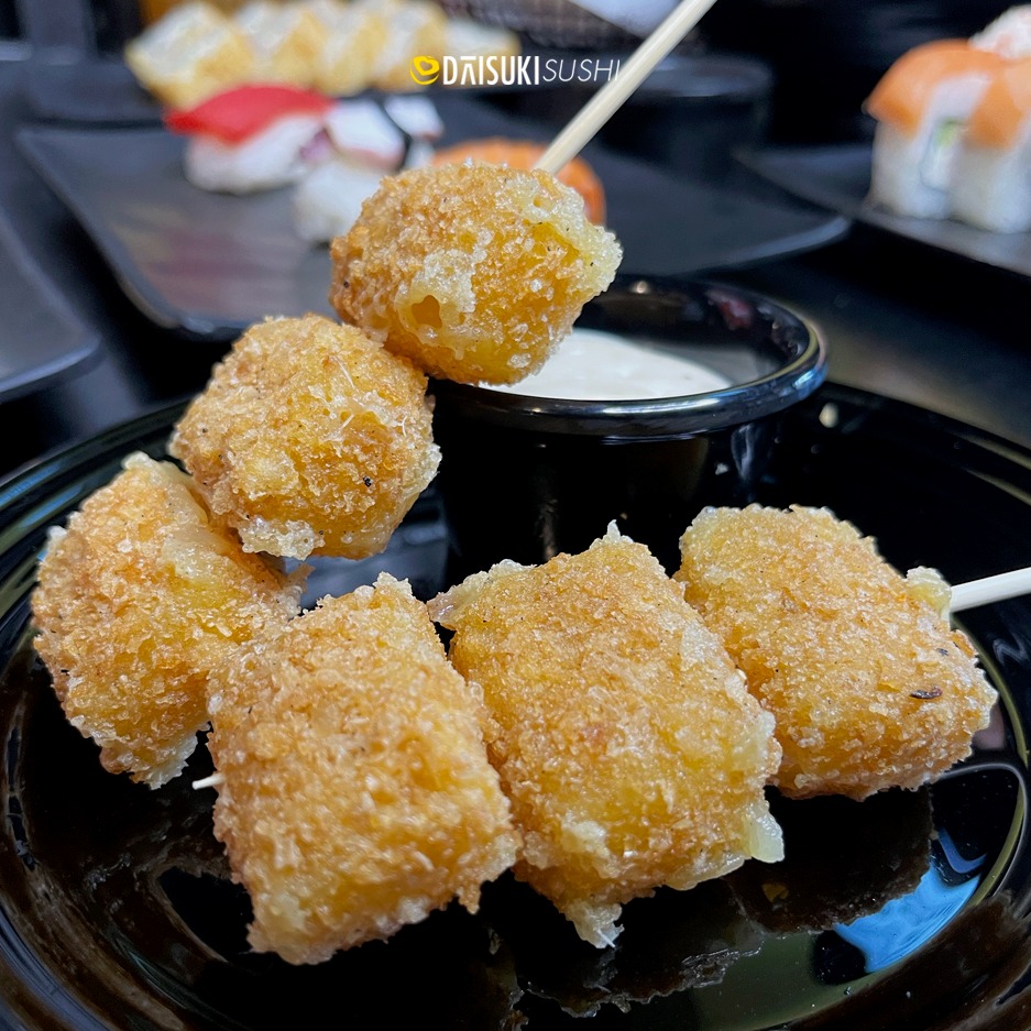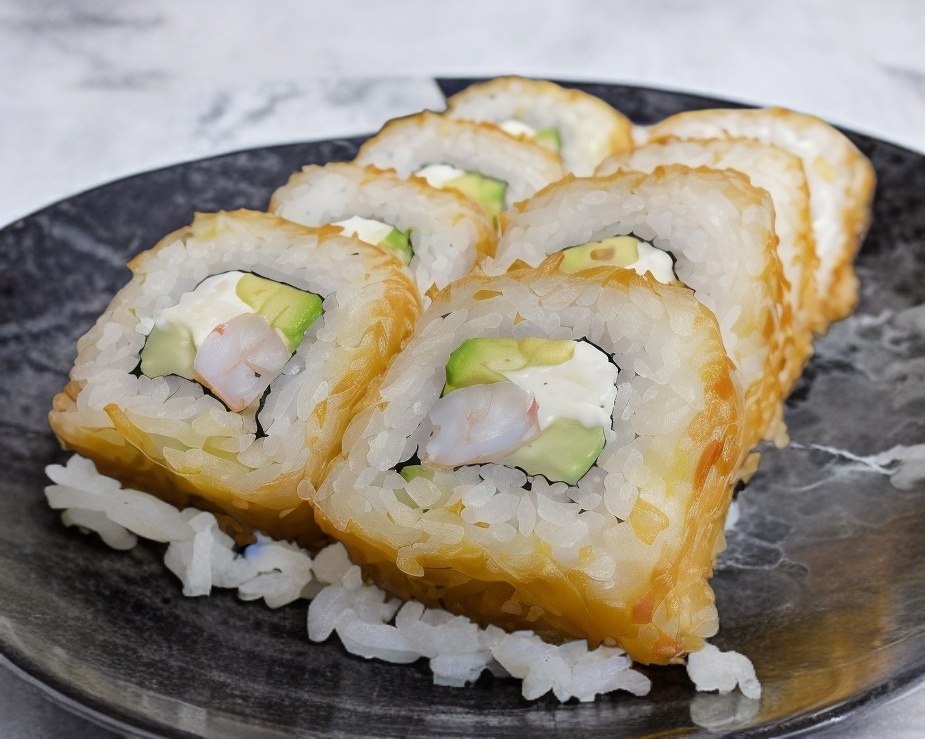 Rollo empanizado cubierto de philadelphia. Todos los rollos tienen aguacate, pepino y philadelphia por dentro además de un ingrediente de tu elección. para una persona