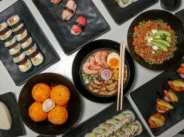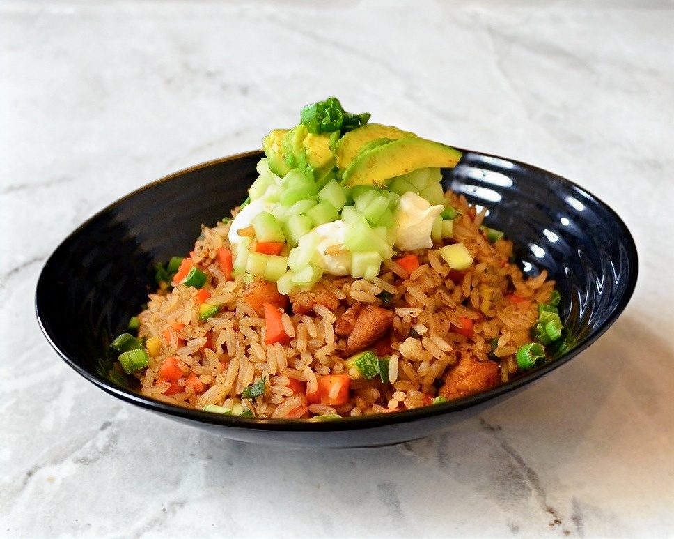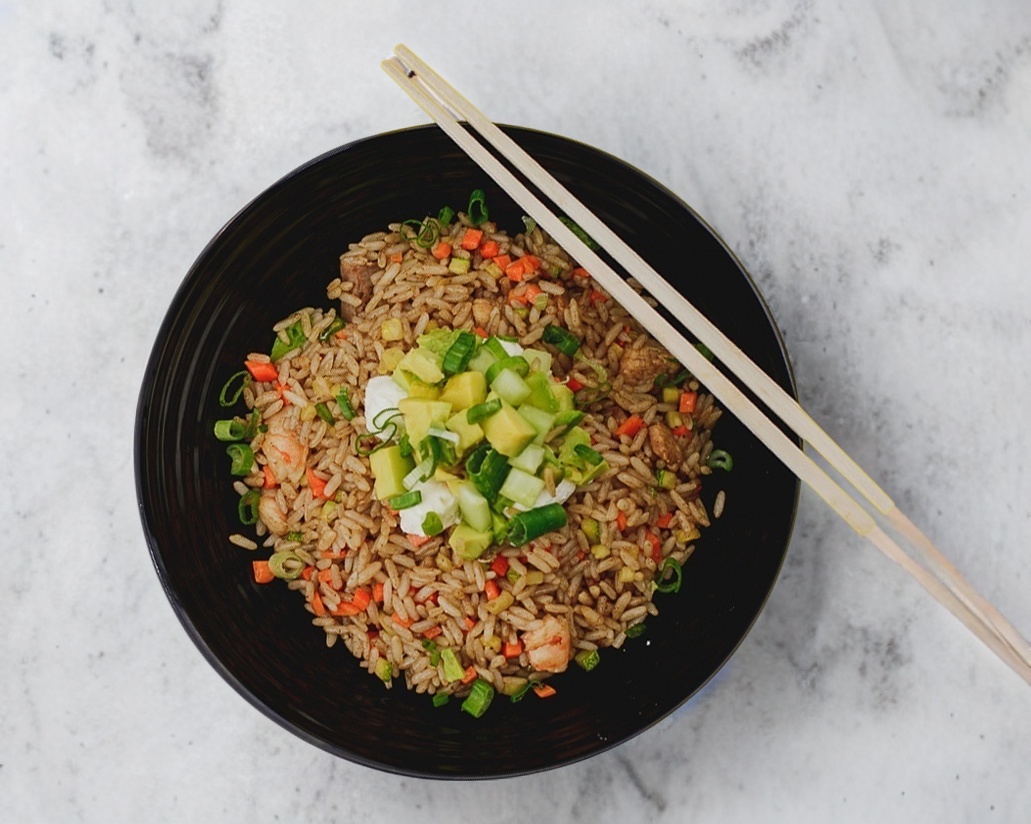 Arroz frito con pollo, camaron, res,calabaza y zanahoria acompañado de aguacate,filadelfia y pepino