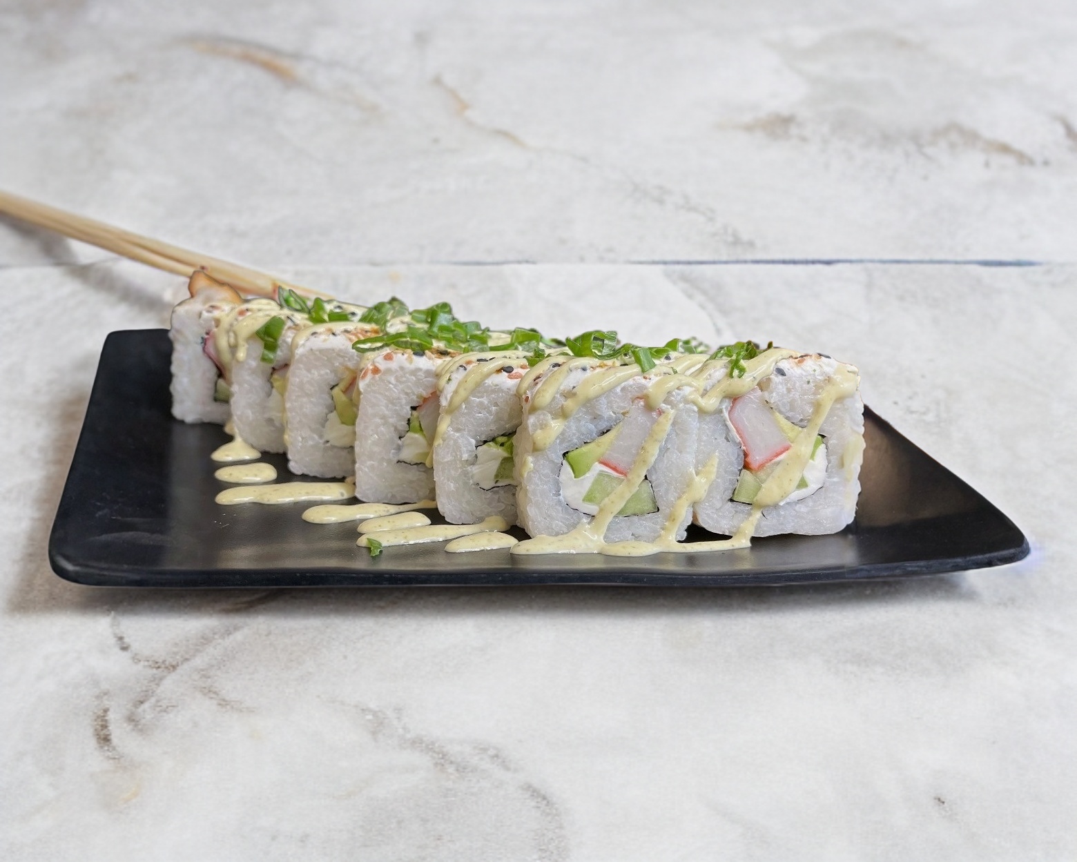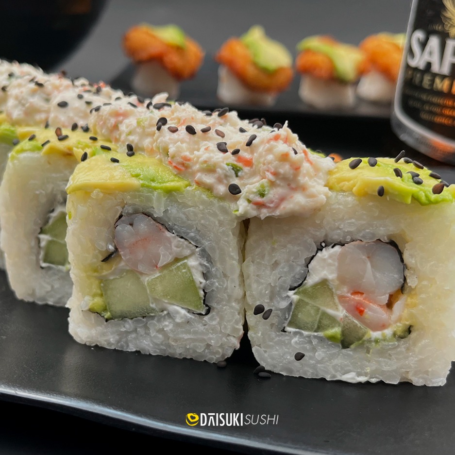Rollo cubierto de aguacate con un topping de tampico, salsa de anguila y ajonjolí. Todos los rollos tienen aguacate, pepino y philadelphia por dentro.