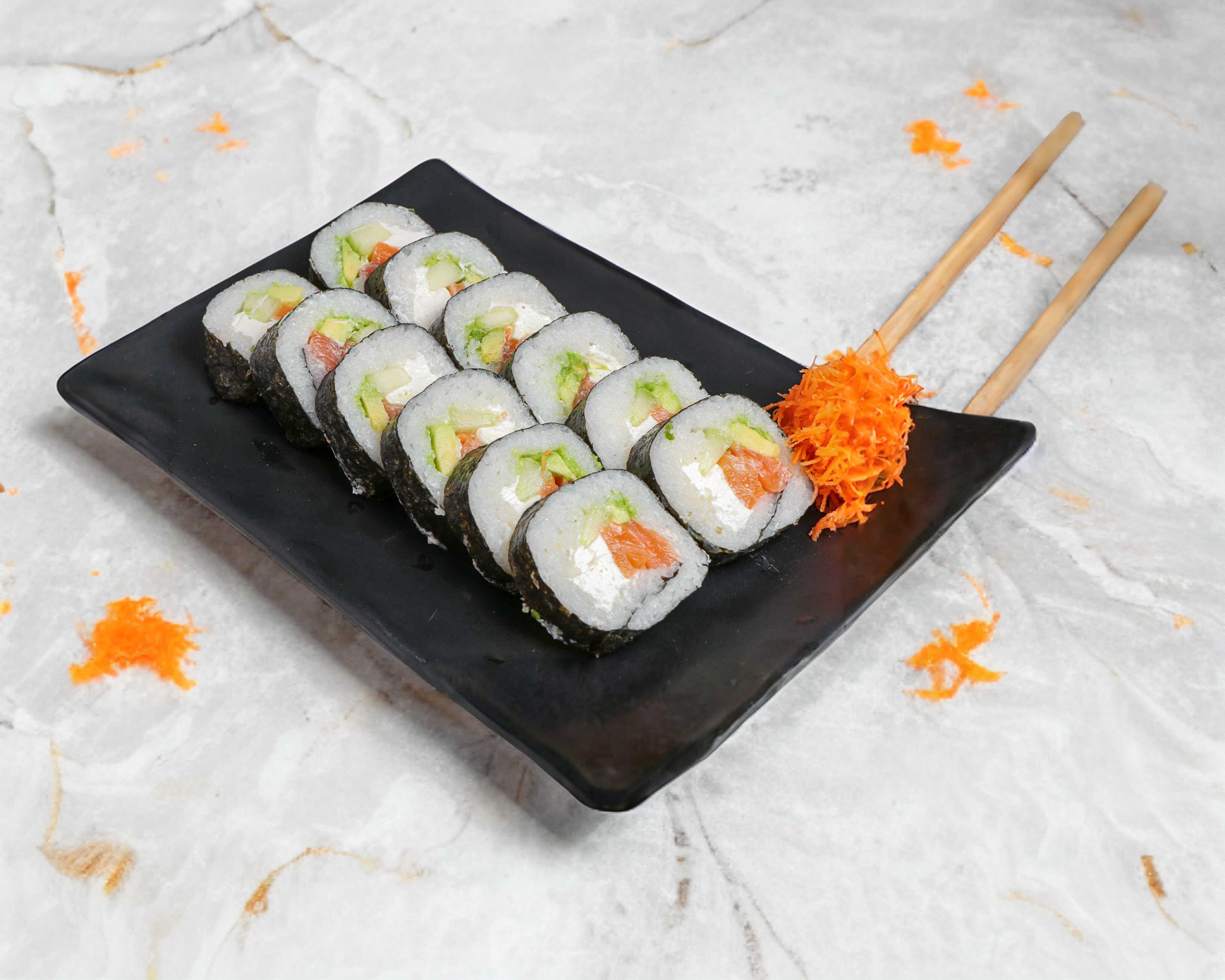 12 piezas de Rollo empanizado. Todos los rollos tienen aguacate, pepino y philadelphia, alga marina y arroz, por dentro además de un ingrediente de tu elección. para una persona
