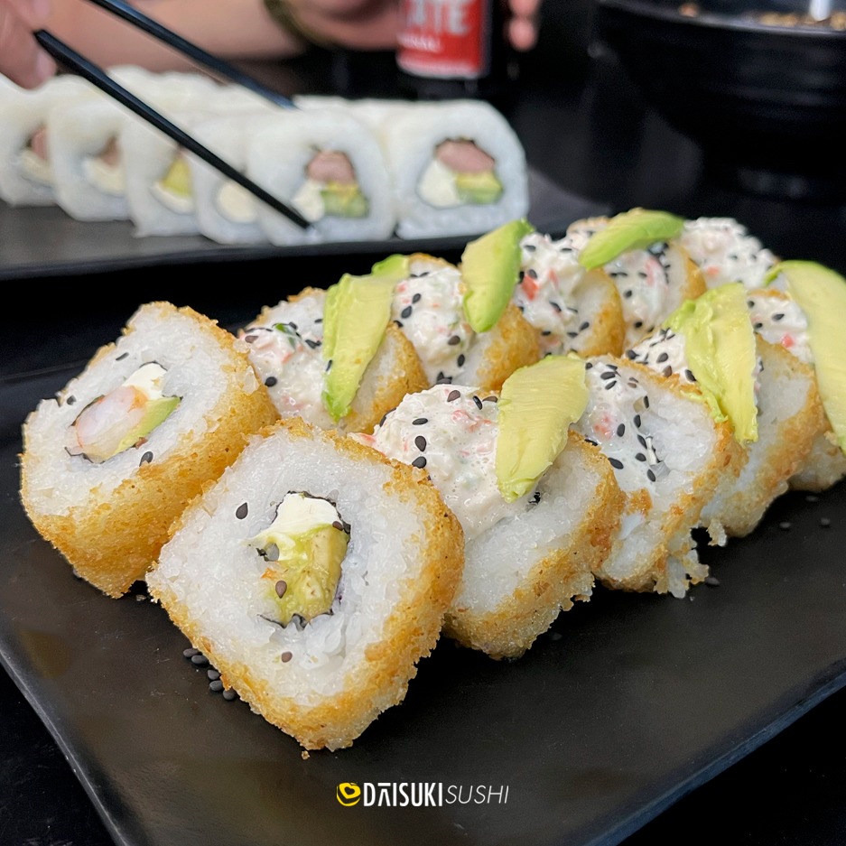 Rollo empanizado con un topping de tampico, aguacate, salsa de anguila y ajonjolí. Todos los rollos tienen aguacate, pepino y philadelphia por dentro además de un ingrediente de tu elección.
