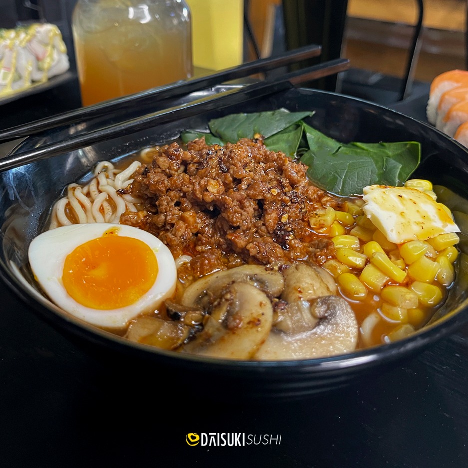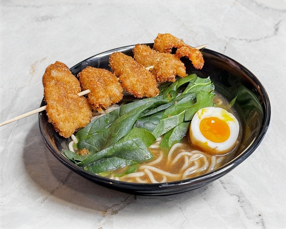 Ramen con caldo spicy, pechuga de pollo empanizada, cebolla crujiente,huevo, cebollín y champiñones