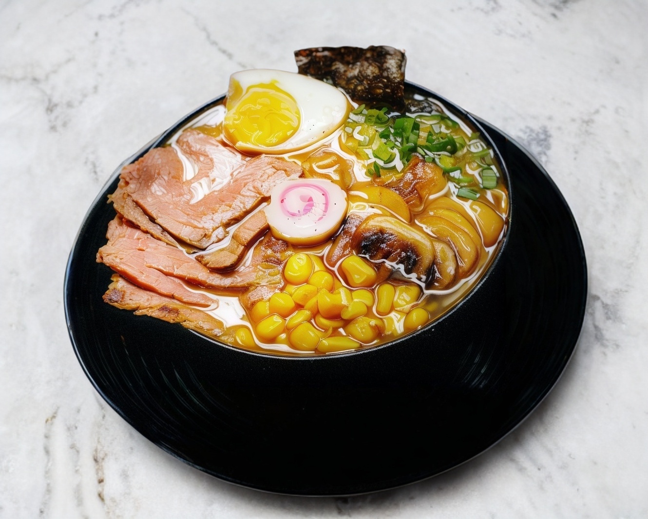 Caldo shoyu, arrachera camarón, elote, cebollin, champiñones, huevo y Naruto