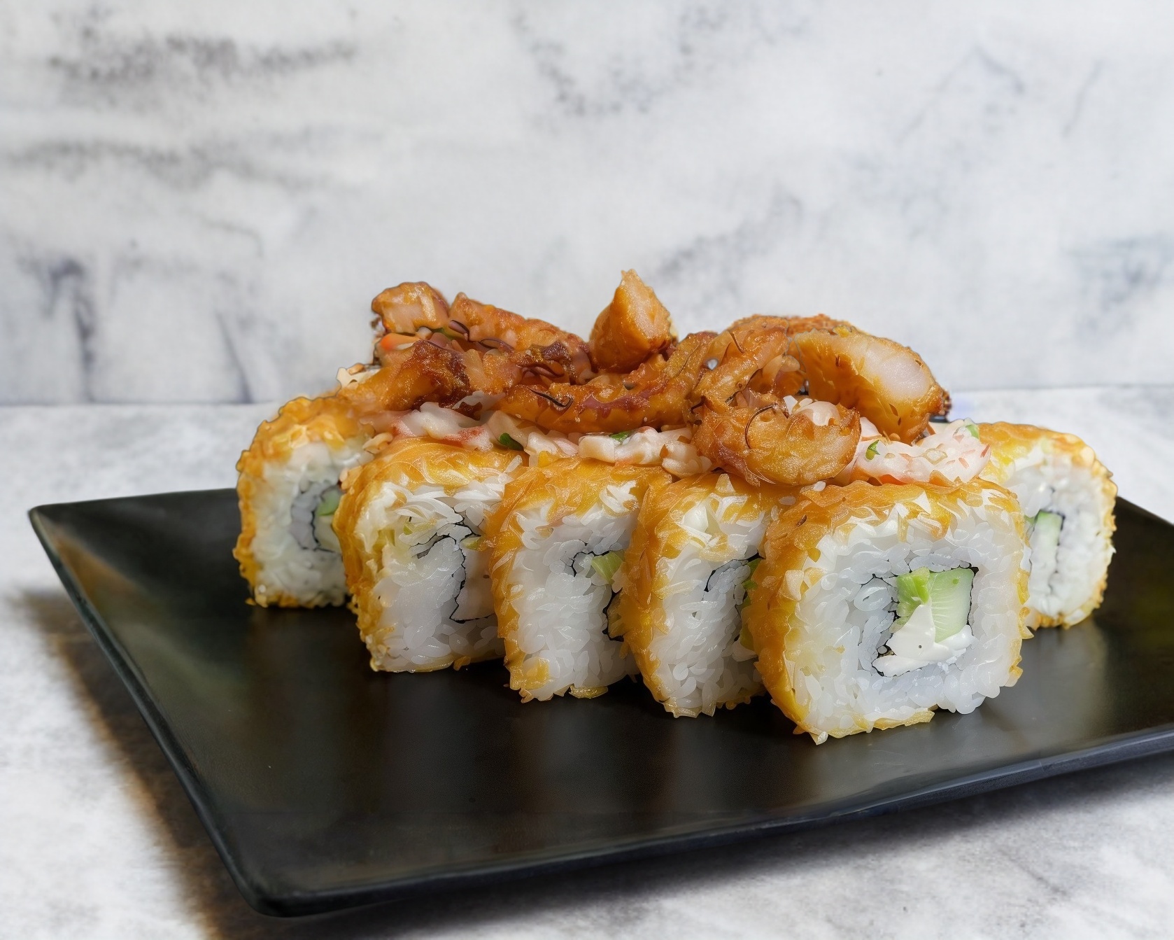 Rollo empanizado relleno de Philadelphia, pepino y aguacate, cubierto e topping de camarones empanizados, Tampico salsa de anguila