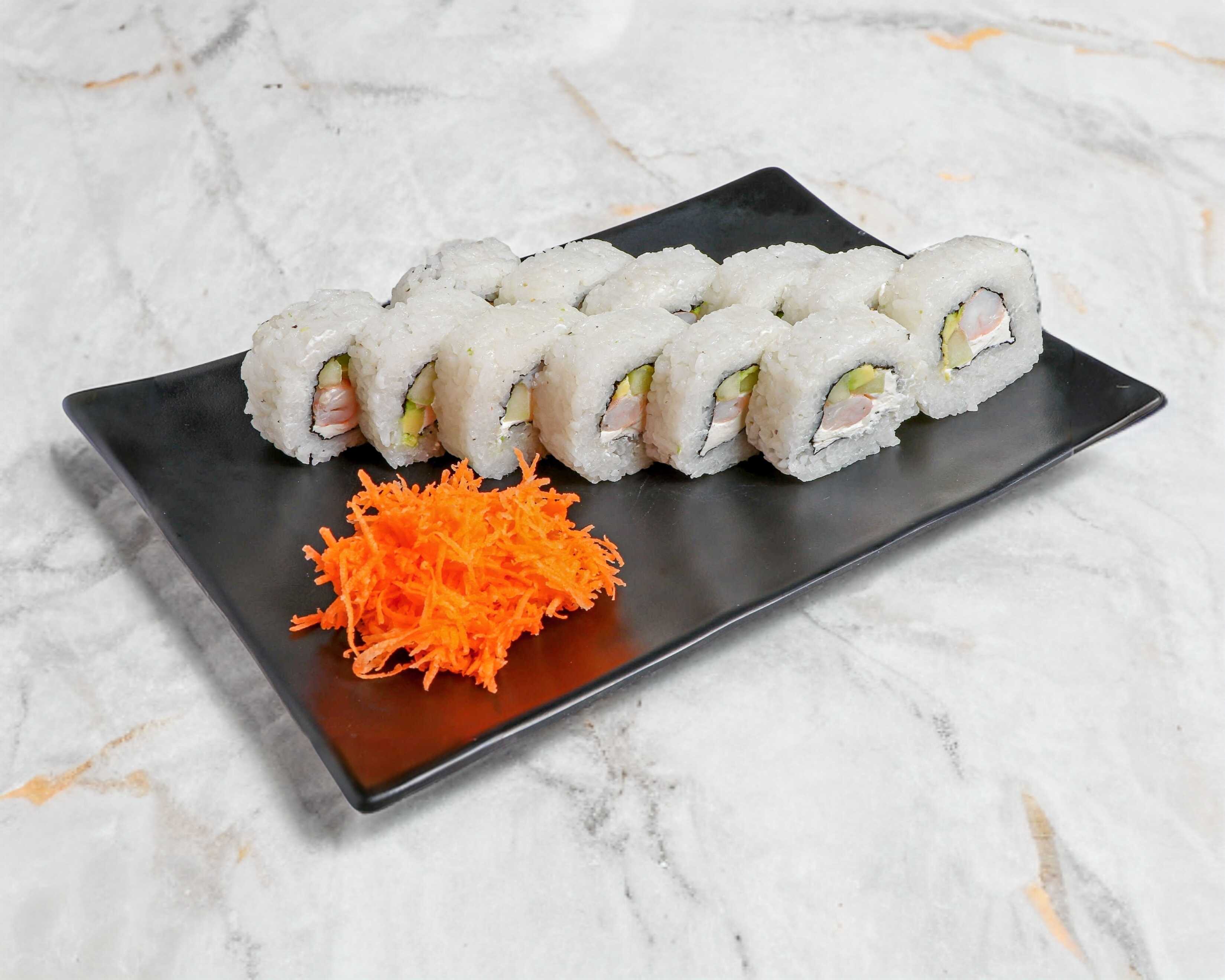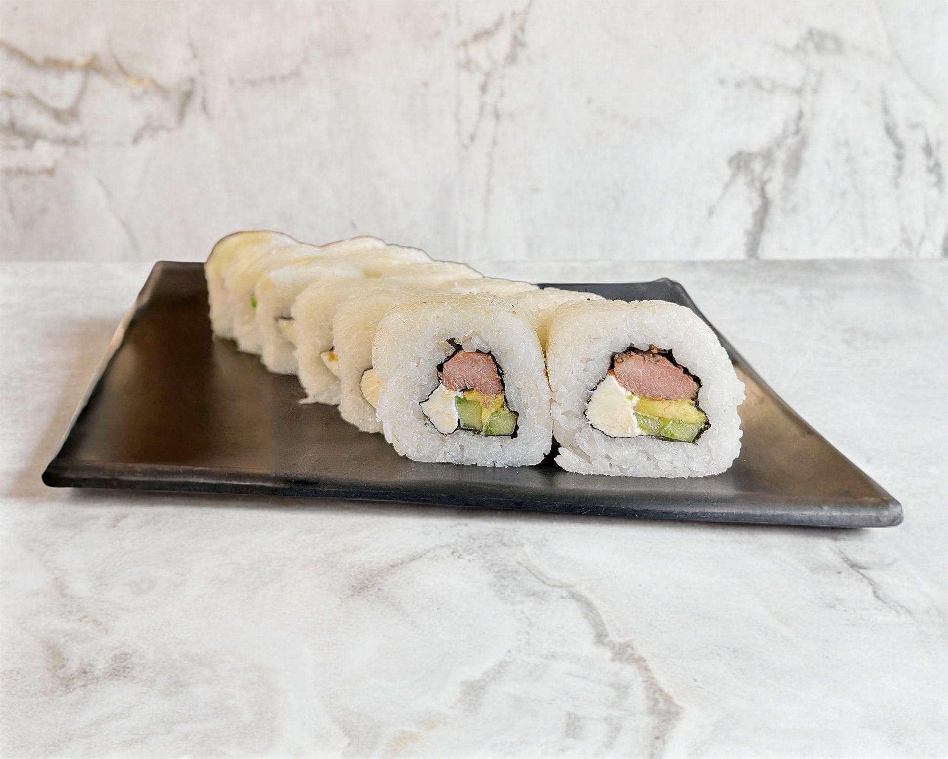 Rollo natural con arroz por fuera. Todos los rollos tienen aguacate, pepino y philadelphia por dentro.