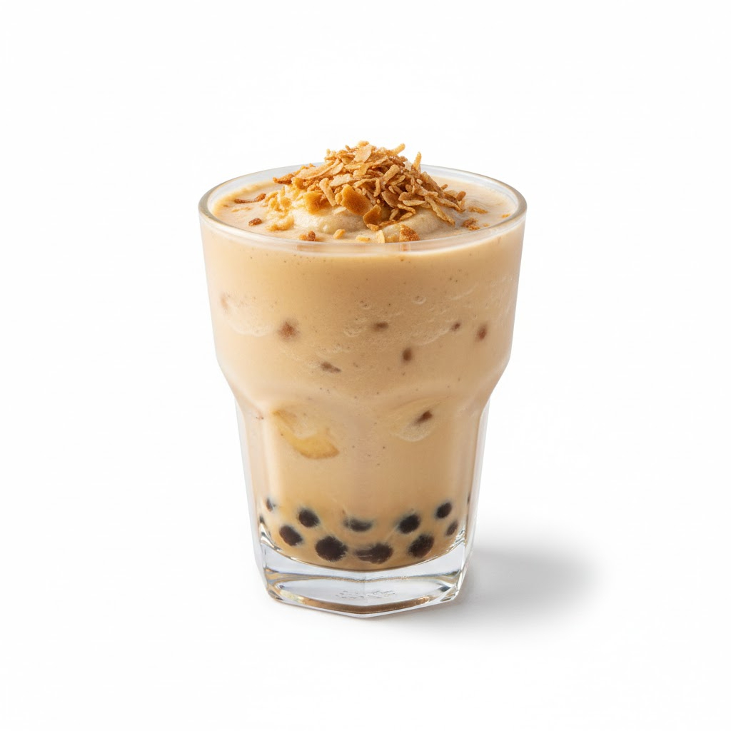 Café, plátano, vainilla y leche de almendras con coco tostado
