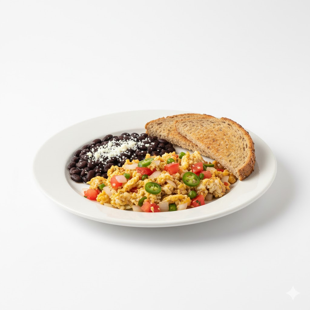 Huevo revuelto con cebolla, tomate y chile, acompañados de frijoles negros y pan multigrano