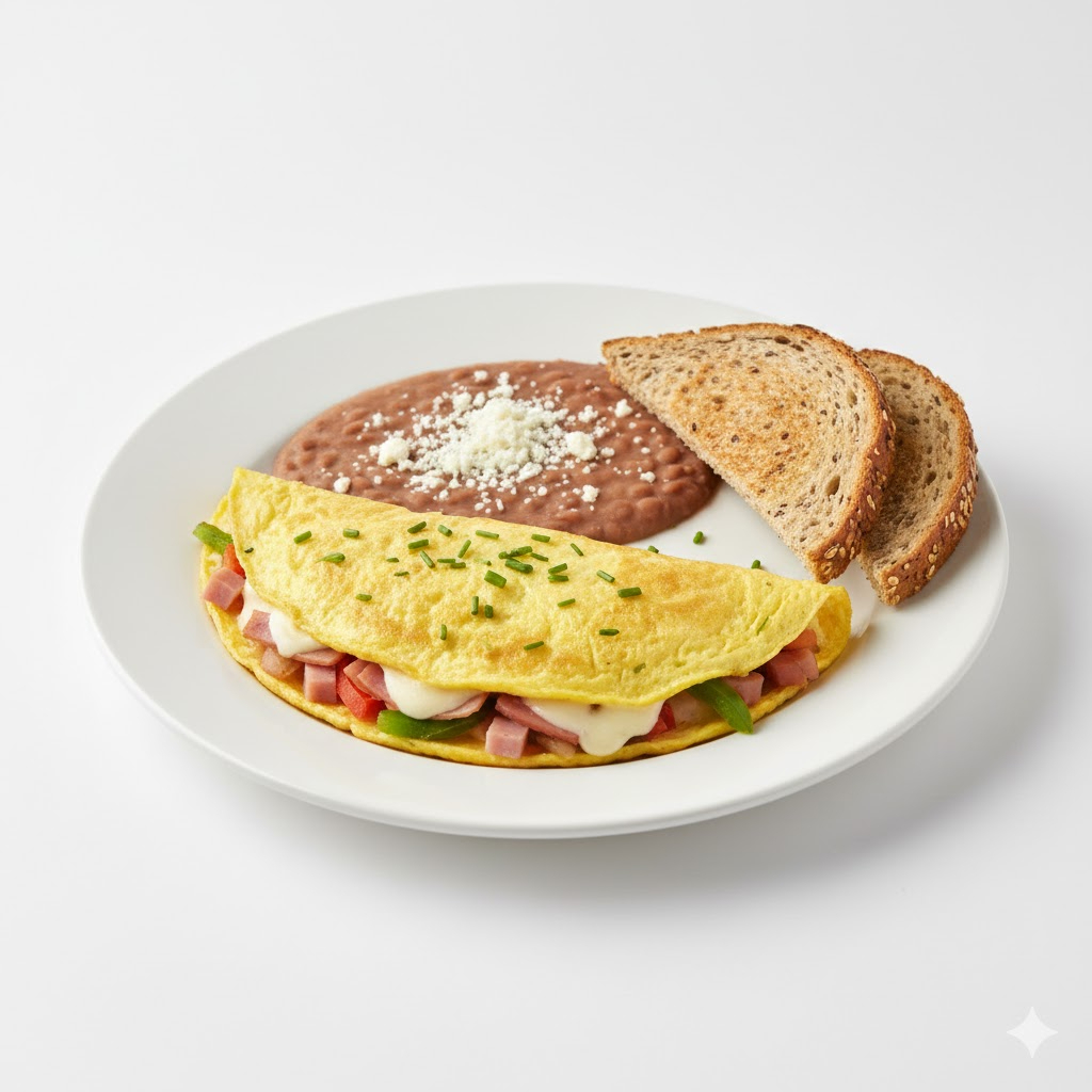 Huevo, omelette al gusto, acompañado de frijoles y pan multigrano