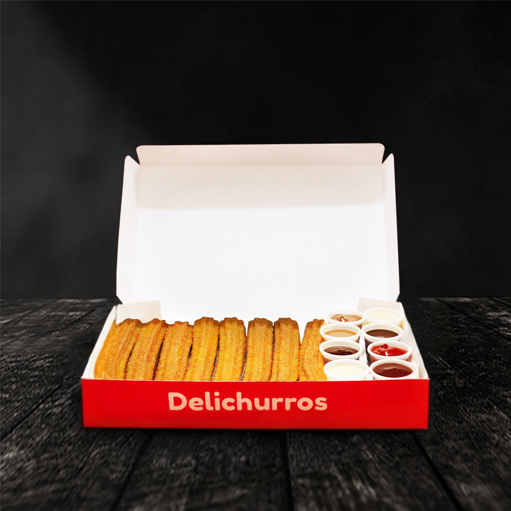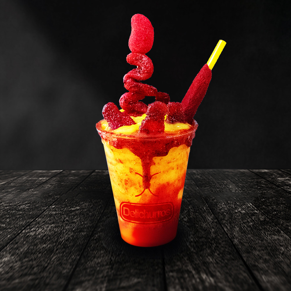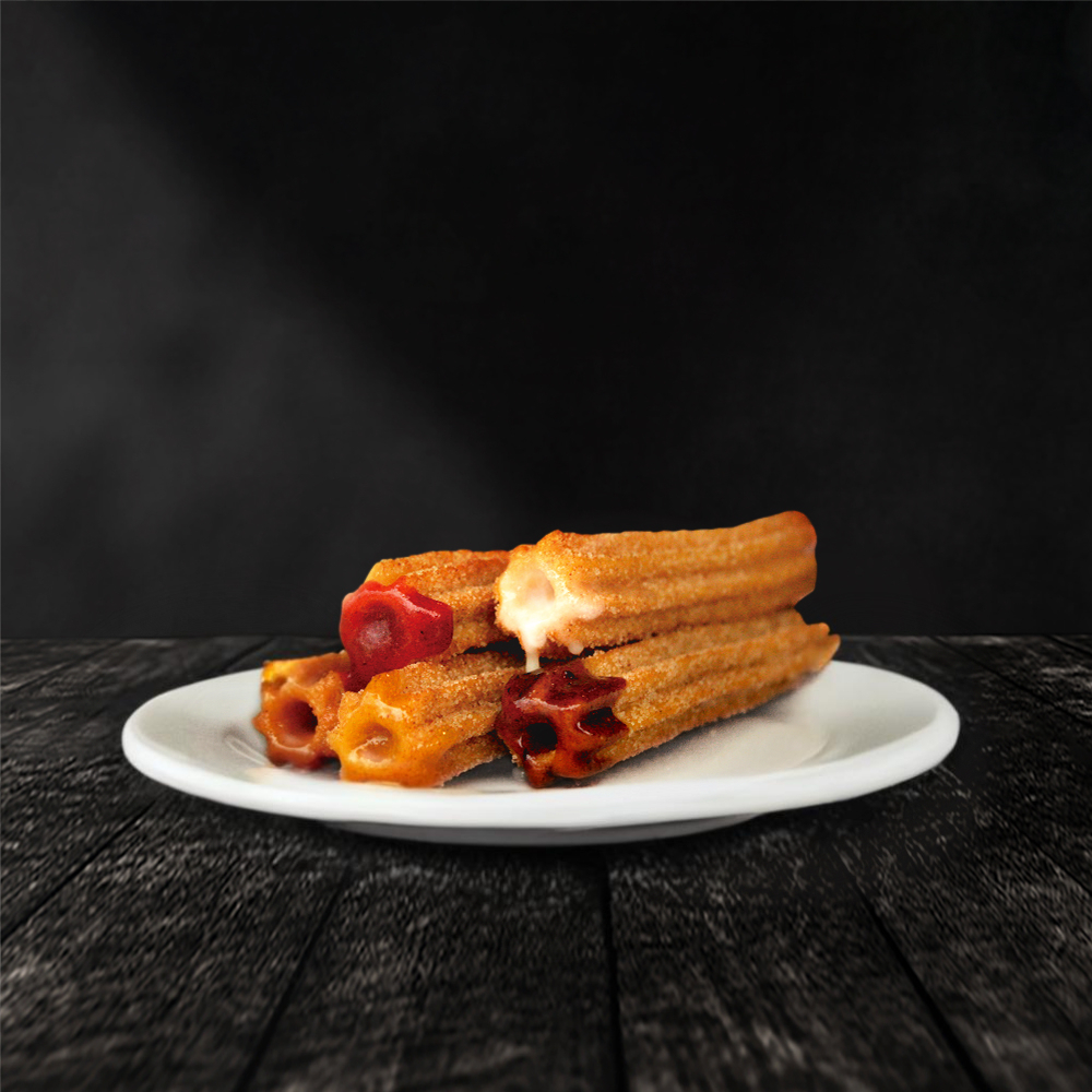 Churro relleno (zarzamora, fresa, leche condensada, chocolate, durazno y cajeta).