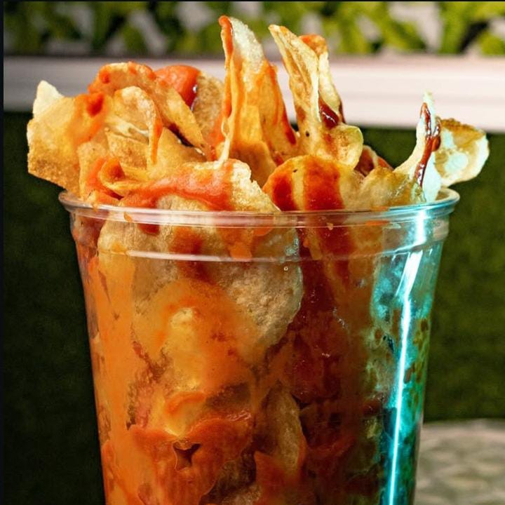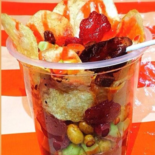 Envase de litro con papa natural, cuerito, pepino, jícama, gomitas, churritos, Clamato, popote de tamarindo y cacahuate.
