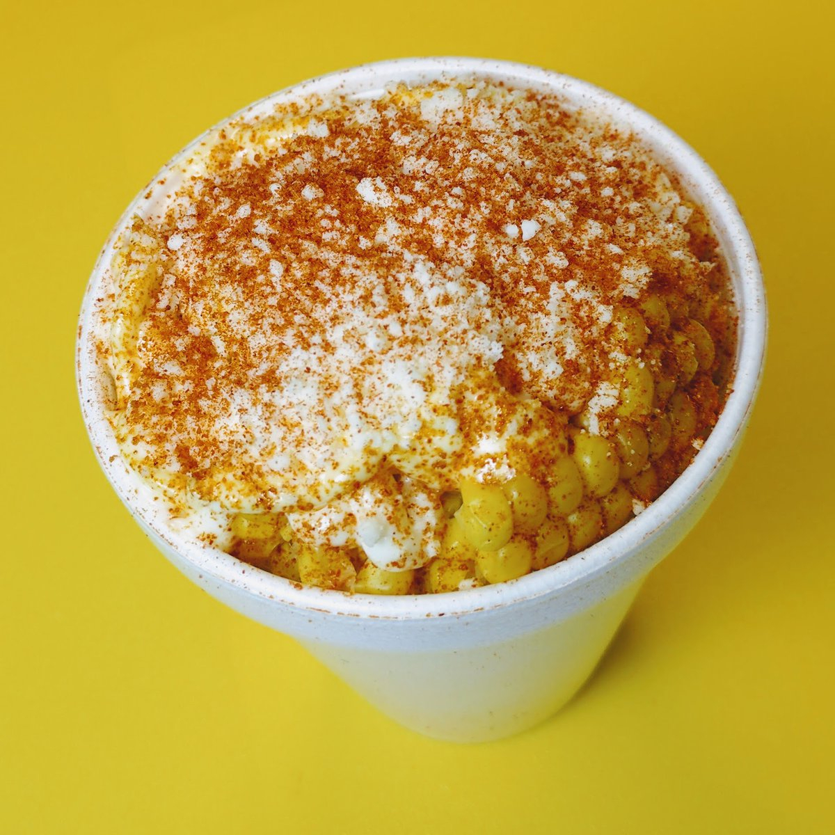 Vaso de medio litro con elote, mayonesa, crema, queso y chile en polvo.