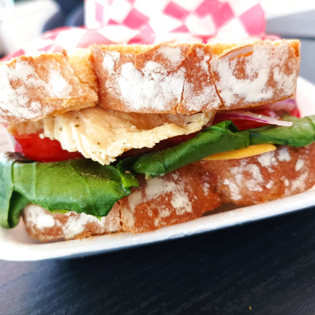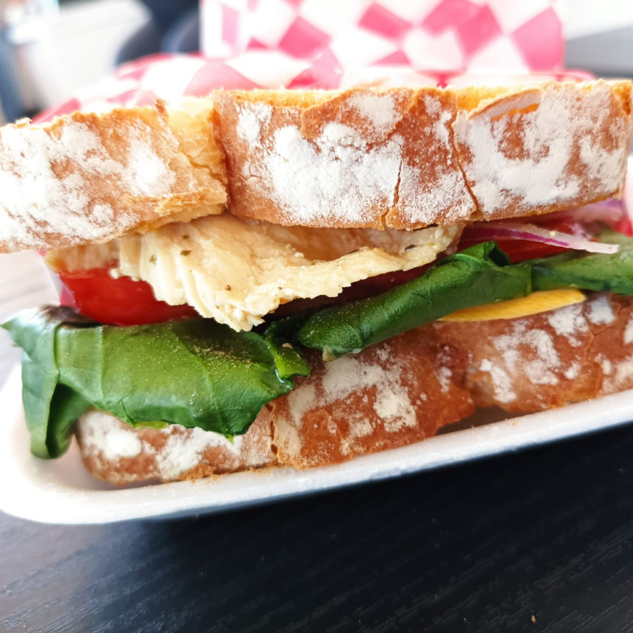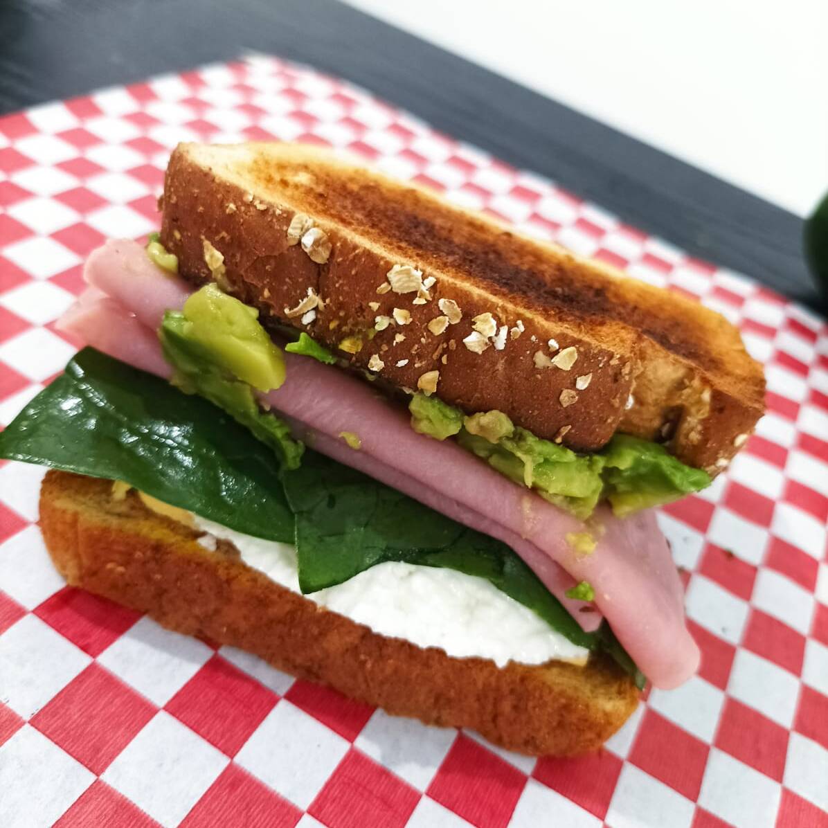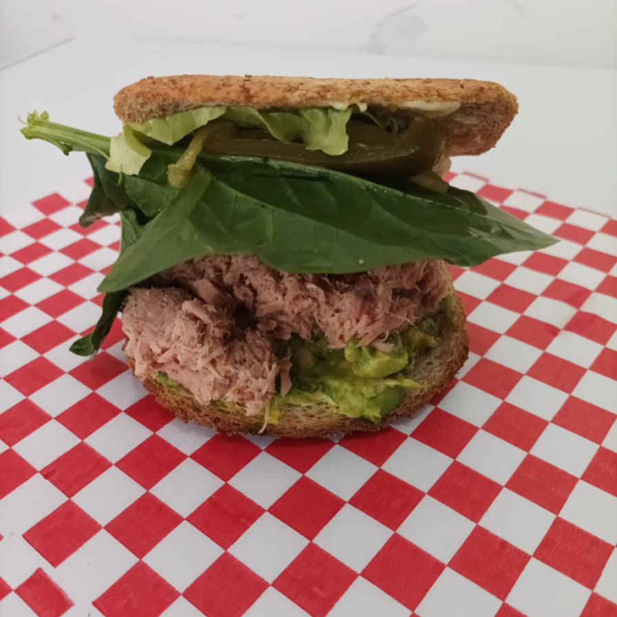 Sandwich de atun con aguacate, atun, espinaca, lechuga, tomate.