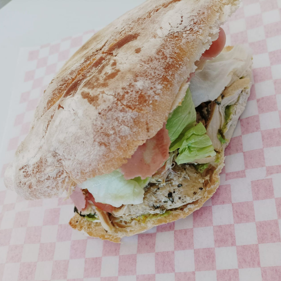 pan estilo lagunero, relleno de pollo, queso amarillo, jamon, aguacate, tomate, cebolla y lechuga