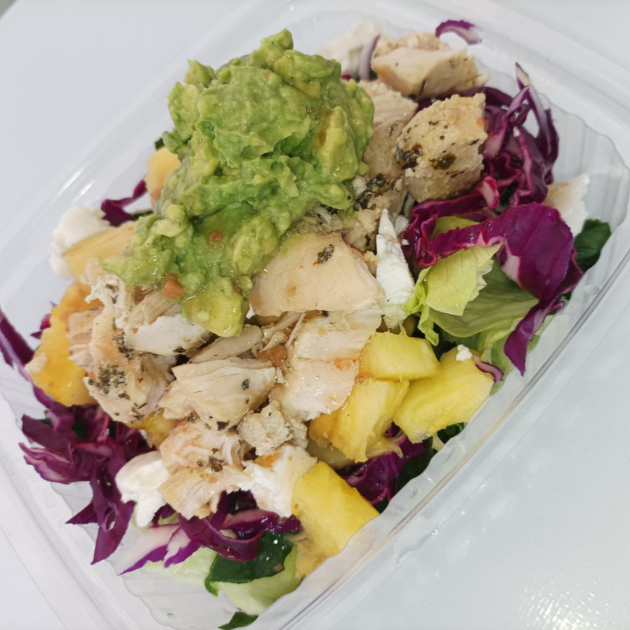 Base de lechuga, espinaca y col morada, acompañada de trocitos de piña, queso panela, pollo y topping de aguacate