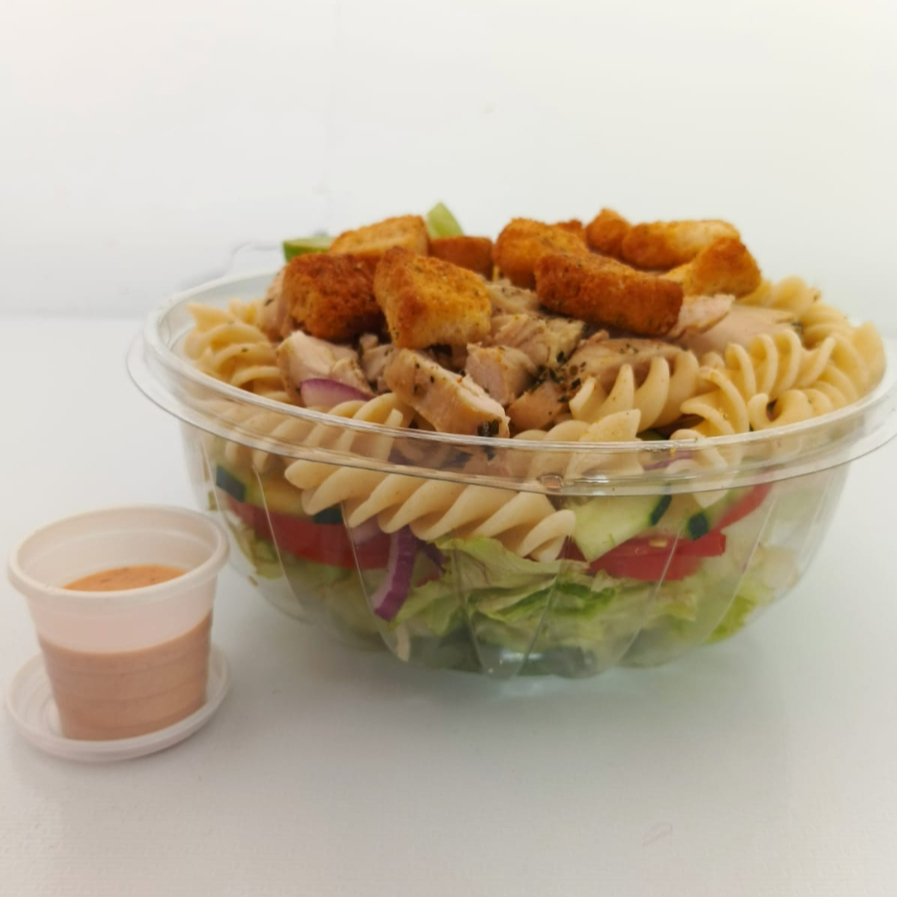 Lechuga, pollo a la plancha, pepino, tomate, cebolla, y pasta.