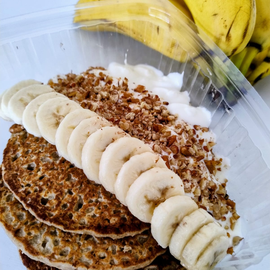 3 piezas de hotcakes de avena, acompañado de fruta de temporada, yoghurt y nuez troceada
