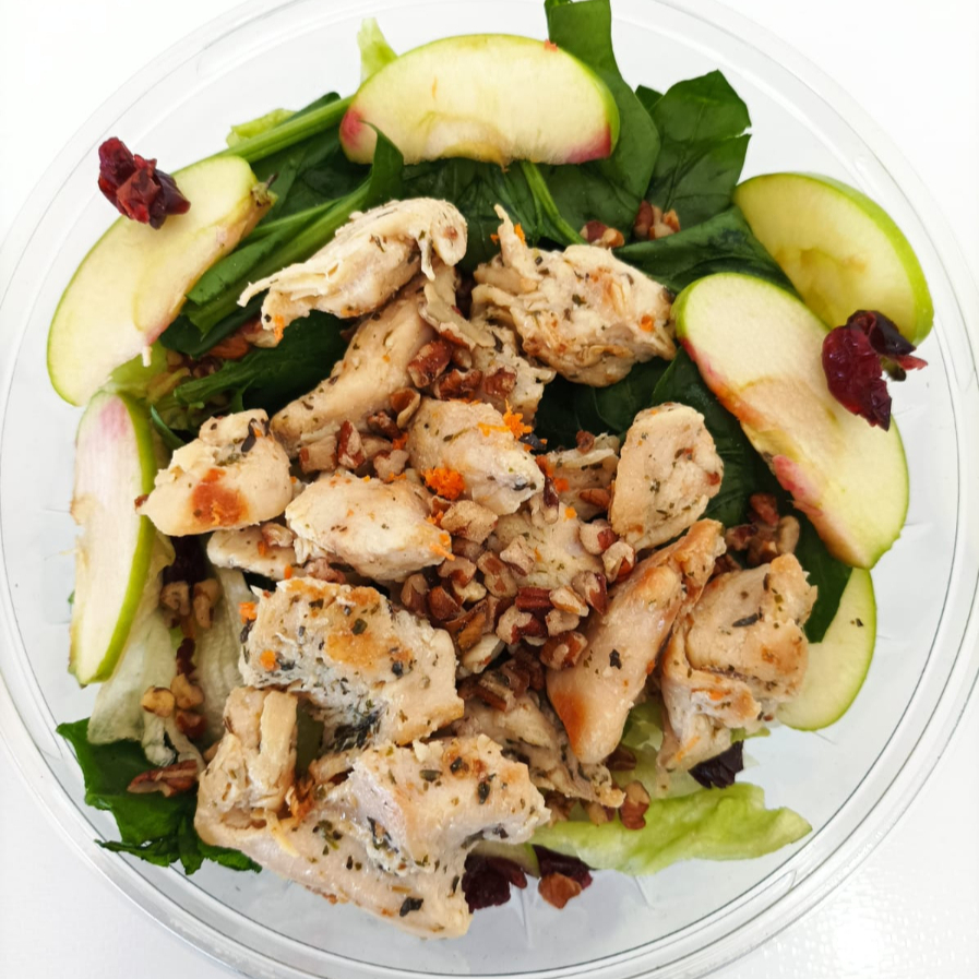 Lechuga, manzana verde, espinaca, nuez, arandanos, pollo a la plancha