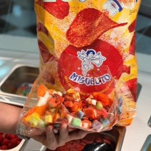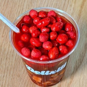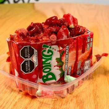 Jugo congelado con diferentes salsas y toppings diferentes a elegir, (fresa, mango y uva) (2 toppings).