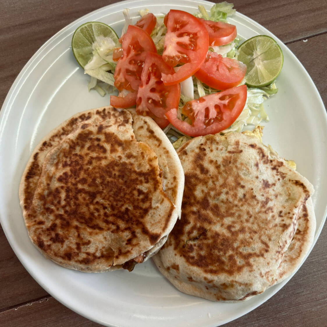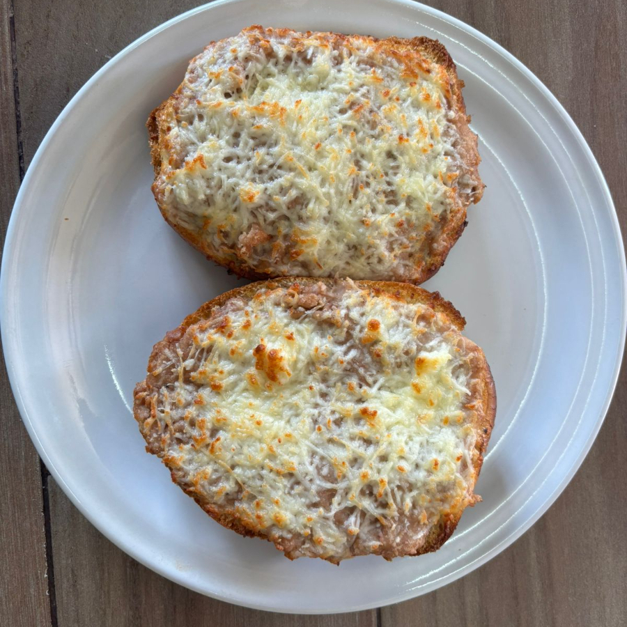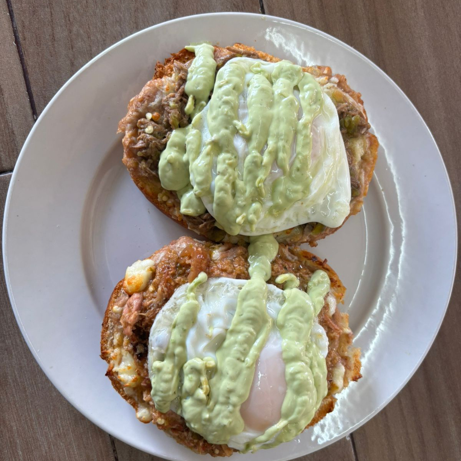 MOLLETES CON DESEHEBRADA Y HUEVITOS ESTRELLADOS BAÑADOS EN ADEREZO DE AGUACATE.