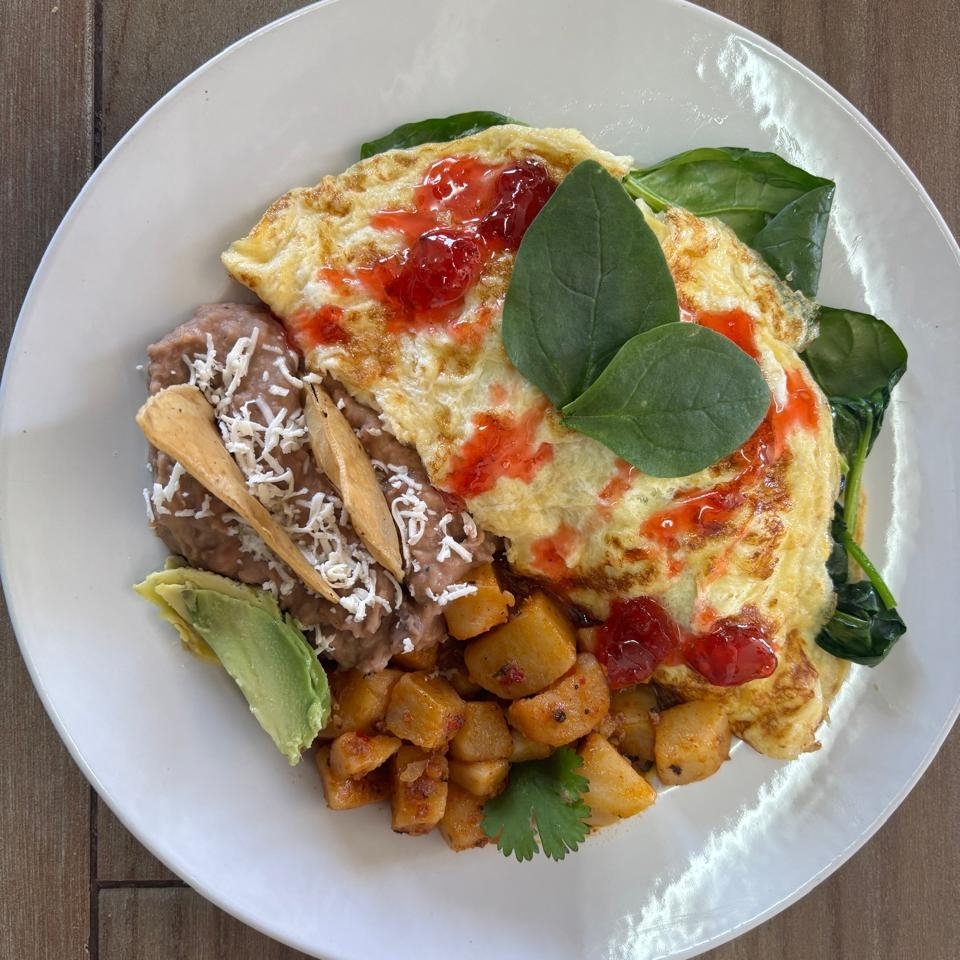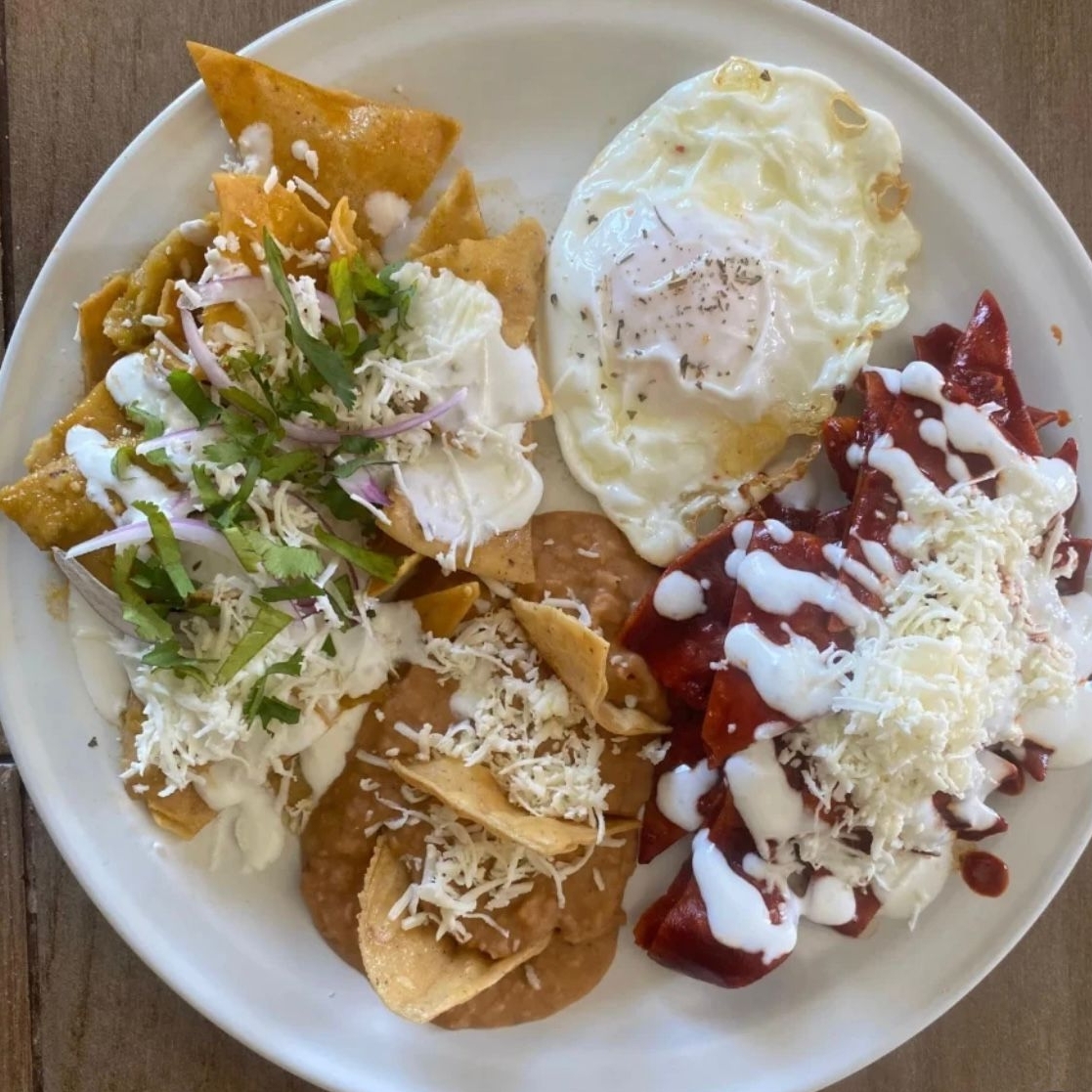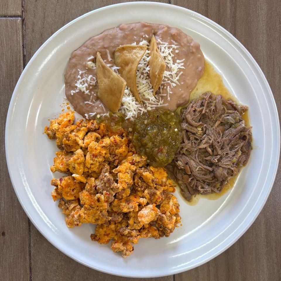 Ricos Chilaquiles Con Huevos Al Gusto, Frijoles com queso Y Papitas Con Chorizo