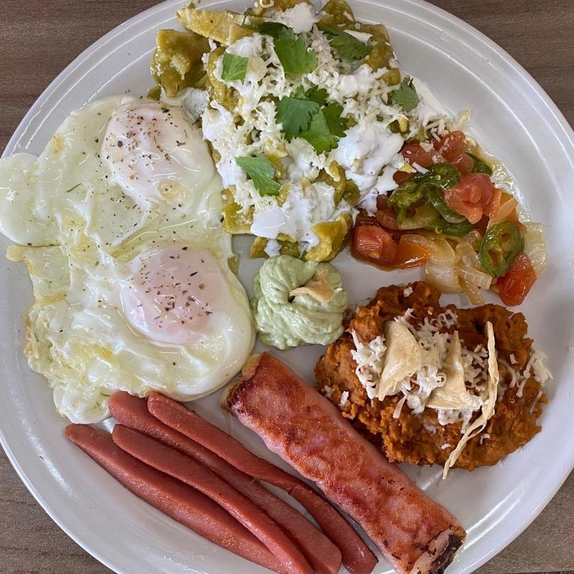 HUEVOS ESTRELLADOS CON UNA PORCION DE CHILAQUILES JAMON RELLENO CON QUESO SALCHICHA DORADA Y PICO DE GALLO GUISADO