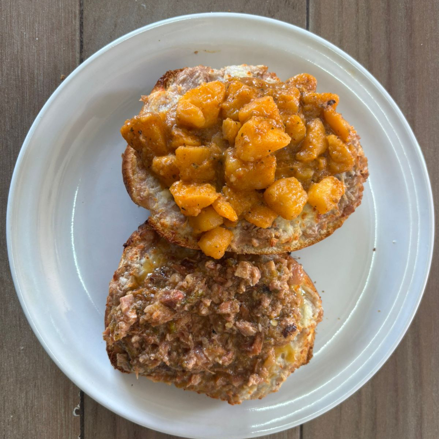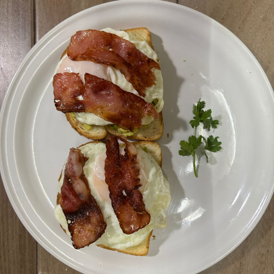 PAN TOSTADO CON UNA CAMA DE AGUACATE, DESEHEBRADA O PRENSADO, HUEVOS ESTRELLADOS Y TOCINO ENCIMA