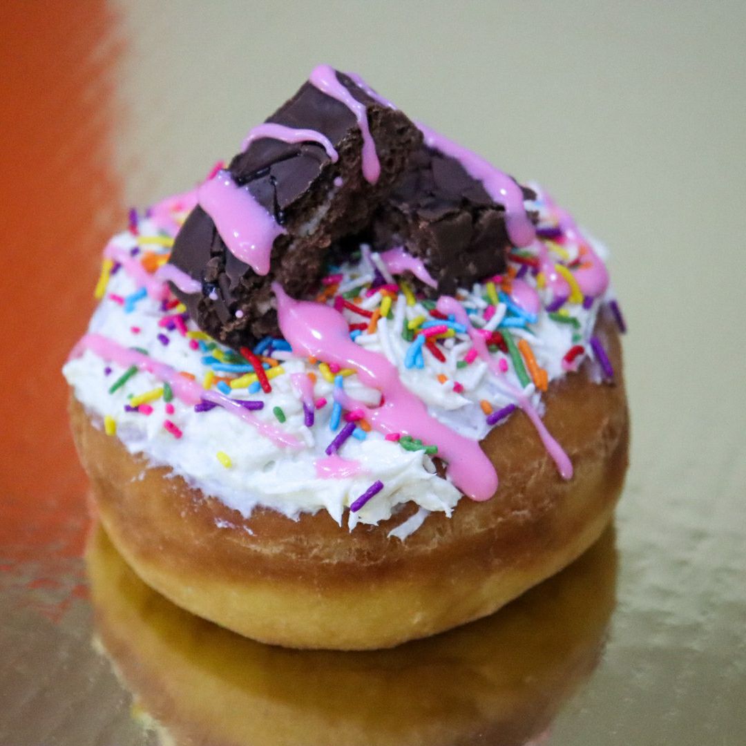 Dona cubierta con queso crema, granillo de colores, decorada con un kinder delice y líneas de glaseado de fresa.