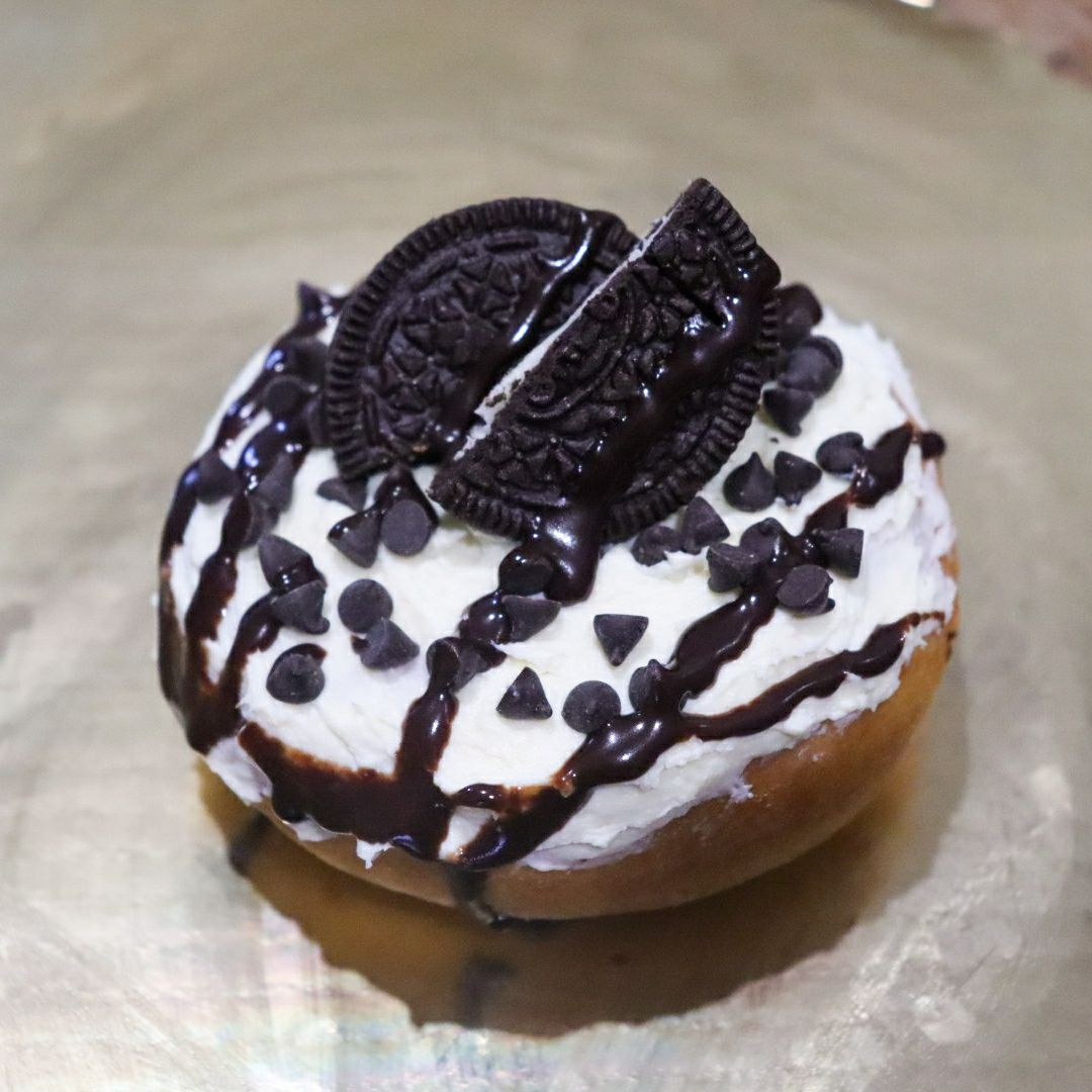 Dona cubierta con betún de queso crema, con trozos de galleta oreo, decorada con chispas de chocolate y líneas de chocolate blanco.