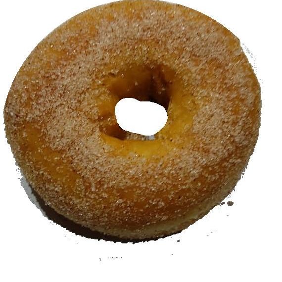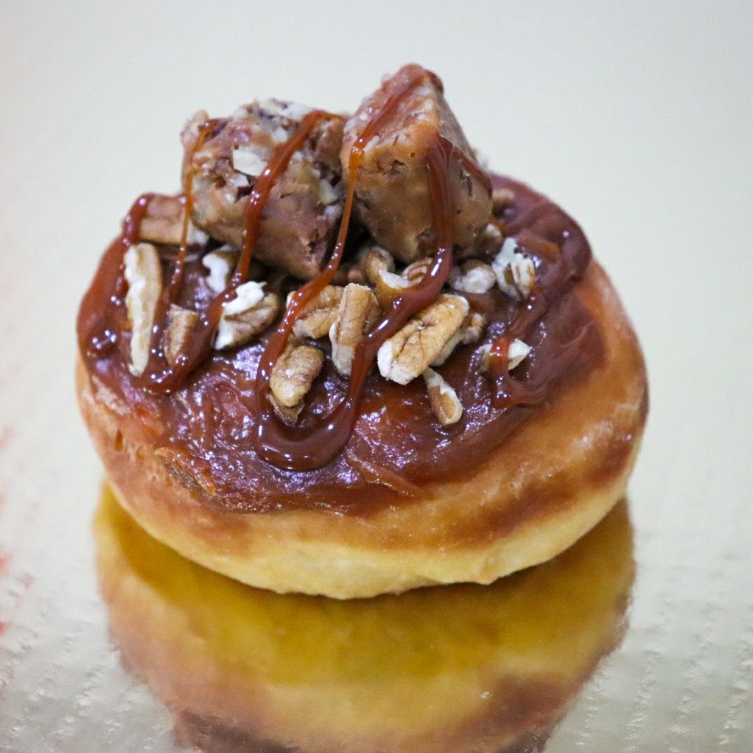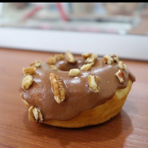 Dona cubierta con dulce de leche, trozos de nuez, decorada con un dulce Gloria y líneas de cajeta quemada.